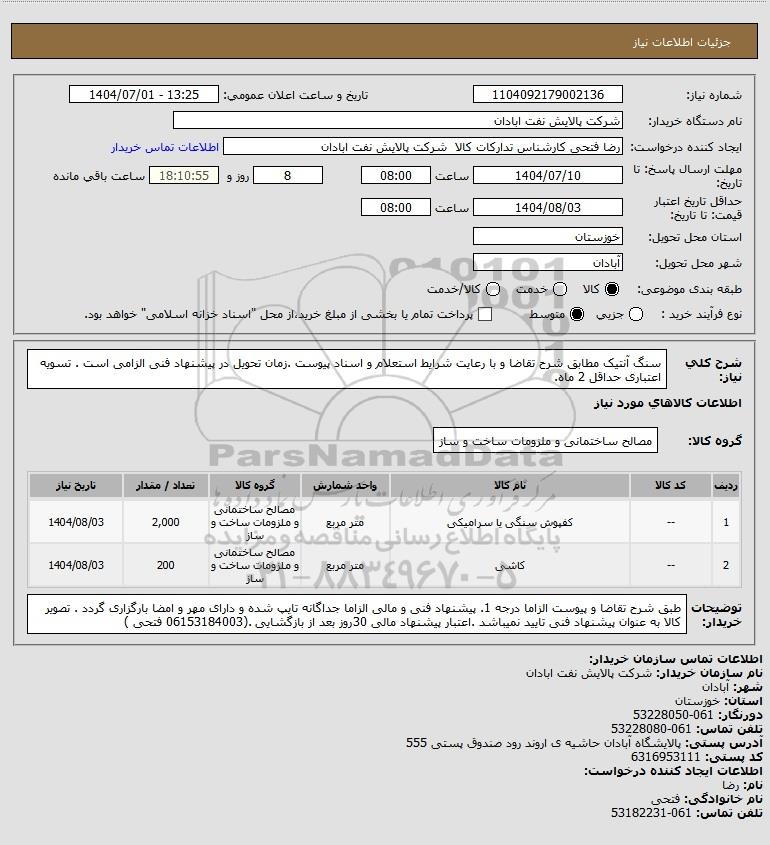 شرح کلی نیاز: سنگ آنتیک مطابق شرح تقاضا و با رعایت شرایط استعلام و اسناد پیوست .زمان تحویل در پیشنهاد فنی الزامی است . تسویه اعتباری حداقل 2 ماه.