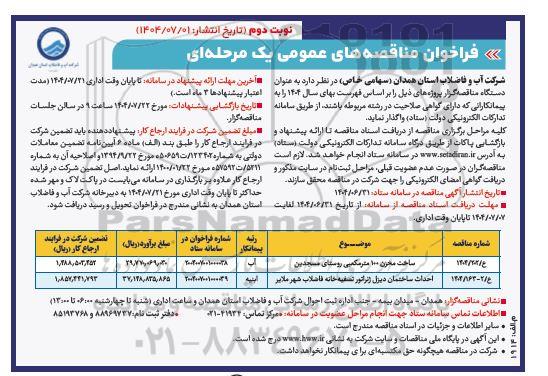 شرکت آب و فاضلاب استان همدان (سهامی خاص) در نظر دارد به عنوان دستگاه مناقصه گزار پروژه های ذیل را بر اساس فهرست بهای سال 1404 را به پیمانکارانی که دارای گواهی صلاحیت در رشته مربوطه باشند از طریق سامانه تدارکات الکترونیکی دولت (ستاد) واگذار نماید. کلیه مراحل برگزاری مناقصه از دریافت اسناد مناقصه تا ارائه پیشنهاد و بازگشایی پاکات از طریق درگاه سامانه تدارکات الکترونیکی دولت (ستاد) به آدرس ستاد ایران در سامانه ستاد انجام خواهد شد. لازم است مناقصه گران در صورت عدم عضویت قبلی، مراحل ثبت نام در سایت مذکور و دریافت گواهی امضای الکترونیکی را جهت شرکت در مناقصه محقق سازند.