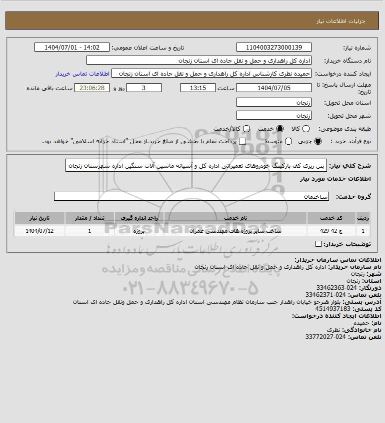 شرح کلی نیاز: بتن ریزی کف پارکینگ خودروهای تعمیراتی اداره کل و آشیانه ماشین آلات سنگین اداره شهرستان زنجان