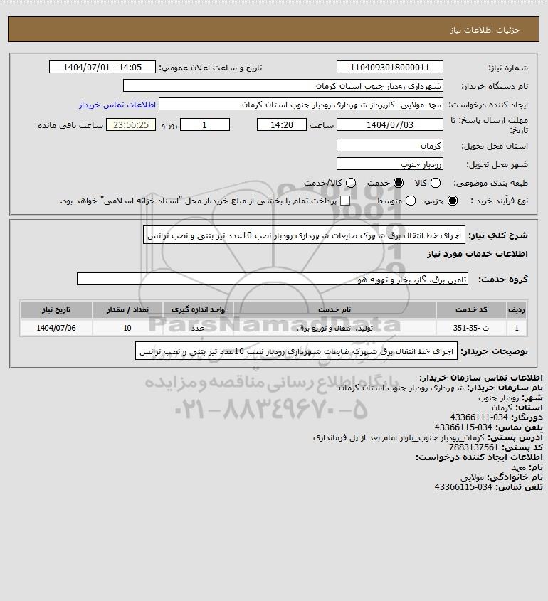 شرح کلی نیاز: اجرای خط انتقال برق شهرک ضایعات شهرداری رودبار نصب 10عدد تیر بتنی و نصب ترانس