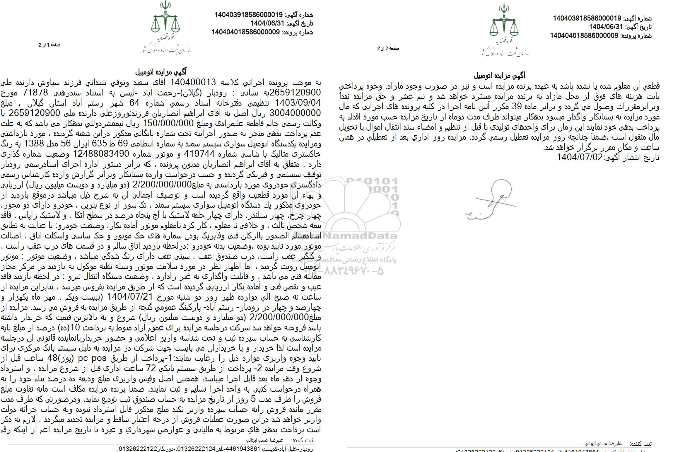 به موجب پرونده اجرائی کلاسه 140400013 آقاى سعید وثوقی سیدانی فرزند سیاوش دارنده ملی -2659120900 به نشانی : رودبار (گیلان) رحمت آباد لیسن به استناد سندرهنی 71878 مورخ 1403.09.04 تنظیمی دفترخانه اسناد رسمی شماره 64 شهر رستم آباد استان گیلان ، مبلغ 3004000000 ریال اصل به آقای ابراهیم انصاریان فرزند تو روز علی دارنده ملی 2659120900 با وکالت رسمی خانم فاطمه علیمرادی ومبلغ 150.000.000 ریال نیمعشر دولتی بدهکار می باشد که به علت عدم پرداخت بدهی منجر به صدور اجراییه تحت شماره بایگانی مذکور در این شعبه گردیده، مورد بازداشتی و مزایده یکدستگاه اتومبیل سواری سیستم سمند به شماره انتظامی 69 ط 635 ایران 56 مدل 1388 به رنگ خاکستری متالیک با شاسی شماره 419744 و موتور شماره 12488083490 وضعیت شماره گذاری دارد ، متعلق به آقای ابراهیم انصاریان مدیون پرونده، که برابر دستور اداره اجرای اسنادرسمی رودبار توقیف سیستمی و فیزیکی گردیده و حسب درخواست وارده بستانکار و برابر گزارش وارده کارشناس رسمی دادگستری خودروی مورد بازداشتی به مبلغ 2.200.000.000 دو میلیارد و دویست میلیون ریال ارزیابی و بهاء أن مورد قطعیت واقع گردیده است و توصیف اجمالی آن به شرح ذیل میباشد در موقع بازدید از خودروی مذکور یک دستگاه اتومبیل سواری سیستم سمند ، تک سوز از نوع بنزین، خودرو دارای دو محور چهار چرخ چهار سیلندر دارای چهار حلقه لاستیک با آج پنجاه درصد در سطح اتکا ، و لاستیک زاپاس ، فاقد بیمه شخص ثالث ، و خلافی نا معلوم ، کار کرد نامعلوم موتور آماده بکار وضعیت خودرو با عنایت به تطابق استاد مسلم الصدور با ارکان فنی و فابریک بودن شماره های حک موتور و حک شاسی و اسکلت اتاق ، اصالت موتور مورد تایید بوده ، وضعیت بدنه خودرو در لحظه بازدید اتاق سالم و در قسمتهای درب عقب راست . و گلگیر عقب راست درب صندوق عقب ، سینی عقب دارای رنگ شدگی میباشد، وضعیت موتور : موتور اتومبیل رویت گردید، اما اظهار نظر در مورد سلامت موتور وسیله نقلیه موکول به بازدید در مرکز مجاز معاینه فنی میباشد و قابلیت واگذاری به غیر را دارد، وضعیت دستگاه انتقال نیرو در لحظه بازدید فاقد عیب و نقص فنی و آماده بکار ارزیابی گردیده است که از طریق مزایده بفروش میرسد ، بنابراین مزایده از ساعت نه صبح الی دوازده ظهر روز دو شنبه مورخ 1404.07.21 نبیست و یکم ، مهر ماه یکهزار و چهارصد و چهار در رودبار رستم آباد پارکینگ عمومی گنجه از طریق مزایده به فروش می رسد. مزایده از مبلغ 2.200.000.000 دو میلیارد و دویست میلیون ریال شروع و به بالاترین قیمت که خریدار داشته باشد فروخته خواهد شد شرکت در جلسه مزایده برای عموم آزاد منوط به پرداخت 10 (ده) درصد از مبلغ پایه کارشناسی به حساب سپرده ثبت و تحت شناسه واریز اعلامی و حضور خریداریا نماینده قانونی آن در جلسه مزایده است لذا خریدار و یا خریداران می بایست جهت شرکت در مزایده به دلیل سیستم بانک مرکزی برای تایید وجوه واریزی موارد ذیل را رعایت نمایند 1 - پرداخت از طریق pc pos (پوز) 48 ساعت قبل از شروع وقت مزایده -2 پرداخت از طریق سیستم بانکی 72 ساعت اداری قبل از شروع مزایده ، و استرداد وجوه از دهم ماه بعد قابل اجرا می باشد همچنین اصل وفیش واریزی مبلغ ودیعه ده درصد بنام خود را به همراه درخواست کتبی به واحد اجرا تسلیم و ثبت نمایند ضمنا برنده مزایده مکلف است ما به تفاوت مبلغ فروش را ظرف مدت 5 روز از تاریخ مزایده به حساب صندوق ثبت تودیع نماید و در صورتی که ظرف مدت مقرر مانده فروش را به حساب سپرده واریز نکند مبلغ مذکور قابل استرداد نبوده و به حساب خزانه دولت واریز خواهد شد در این صورت عملیات فروش از درجه اعتبار ساقط و مزایده تجدید میگردد ، لازم به ذکر است پرداخت بدهی های مربوط به مالیاتی و عوارض شهرداری و غیره تا تاریخ مزایده اعم از اینکه رقم قطعی آن معلوم شده یا نشده باشد به عهده برنده مزایده است و نیز در صورت وجود مازاد، وجوه پرداختی بابت هرینه های فوق از محل مازاد به برنده مزایده مسترد خواهد شد و تیم عشر و حق مزایده نقدا و برابر مقررات وصول م