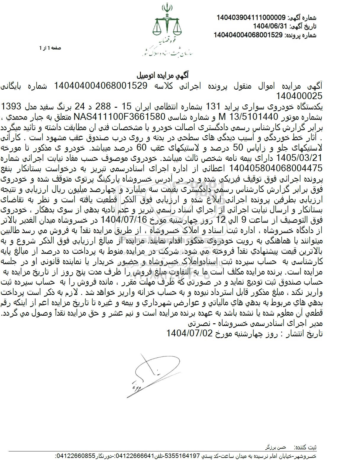 آگهی مزایده اموال منقول پرونده اجرائی کلاسه 140404004068001529 شماره بایگانی 140400025 یکدستگاه خودروی سواری پراید 131 بشماره انتظامی ایران 15 - 288 د 24 برنگ سفید مدل 1393 ، متعلق به جبار محمدی NAS411100F3661580 بشماره موتور 13.5101440 و شماره شاسی برابر گزارش کارشناس رسمی دادگستری اصالت خودرو با مشخصات فنی ان مطابقت داشته و تائید میگردد آثار خط خوردگی و آسیب دیدگی های سطحی در بدنه و روی درب صندوق عقب مشهود است . کارایی لاستیکهای جلو و زاپاس 50 درصد و لاستیکهای عقب 60 درصد میباشد خودروی مذکور تا مورخه 1405.03.21 دارای بیمه نامه شخص ثالث میباشد خودروی موصوف حسب مفاد نیابت اجرائی شماره 140405804068004475 اعطائی از اداره اجرای اسنادرسمی تبریز به درخواست بستانکار بنفع پرونده اجرائی فوق توقیف فیزیکی شده و در در آدرس خسروشاه پارکینگ پرتوی متوقف شده و خودروی فوق برابر گزارش کارشناس رسمی دادگستری بقیمت سه میلیارد و چهارصد میلیون ریال ارزیابی و نتیجه ارزیابی بطرفین پرونده اجرائی ابلاغ شده و ارزیابی فوق الذکر قطعیت یافته است و نظر به تقاضای بستانکار و ارسال نیابت اجرائی از اجرای اسناد رسمی تبریز و عدم تادیه بدهی از سوی بدهکار ، خودروی فوق التوصیف از ساعت 9 الی 12 روز چهارشنبه مورخ 1404.07.16 در خسروشاه میدان الغدیر بالاتر از دادگاه خسروشاه، اداره ثبت اسناد و املاک خسروشاه، از طریق مزایده نقدا به فروش می رسد طالبین میتوانند با هماهنگی به رویت خودروی مذکور اقدام نمایند مزایده از مبالغ ارزیابی فوق الذکر شروع و به بالاترین قیمت پیشنهادی نقداً فروخته می شود شرکت در مزایده منوط به پرداخت ده درصد از مبالغ پایه کارشناسی به حساب سپرده ثبت اسناد و املاک خسروشاه و حضور خریدار یا نماینده قانونی او در جلسه مزایده است. برنده مزایده مکلف است ما به التفاوت مبلغ فروش را ظرف مدت پنج روز از تاریخ مزایده به حساب صندوق ثبت تودیع نماید و در صورتی که ظرف مهلت مقرر ، مانده فروش را به حساب سپرده ثبت واریز نکند ، مبلغ مذکور قابل استرداد نبوده و به حساب خزانه واریز خواهد شد . لازم به ذکر است پرداخت بدهی های مربوط به بدهی های مالیاتی و عوارض شهرداری و بیمه و غیره تا تاریخ مزایده اعم از اینکه رقم قطعی ان معلوم شده یا نشده باشد به عهده برنده مزایده است و نیم عشر و حق مزایده نقداً وصول می گردد. مدیر اجرای اسنادرسمی خسروشاه - نصرتی