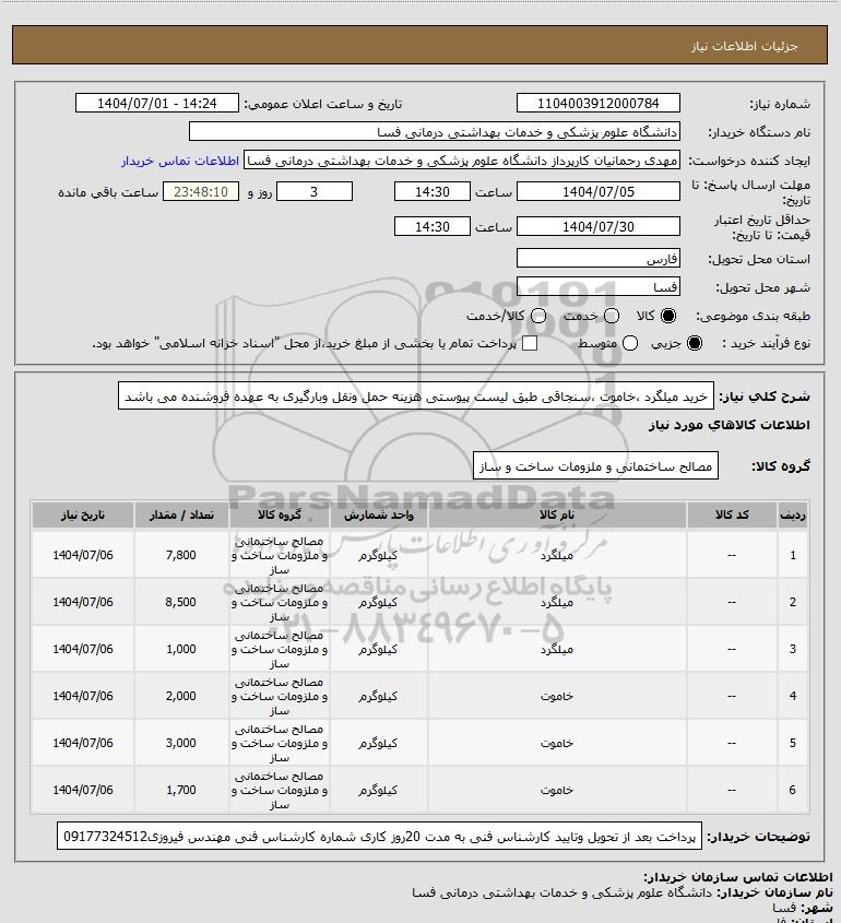 3 -- میلگرد کیلوگرم مصالح ساختمانی و ملزومات ساخت و ساز 1,000 1404/07/06
