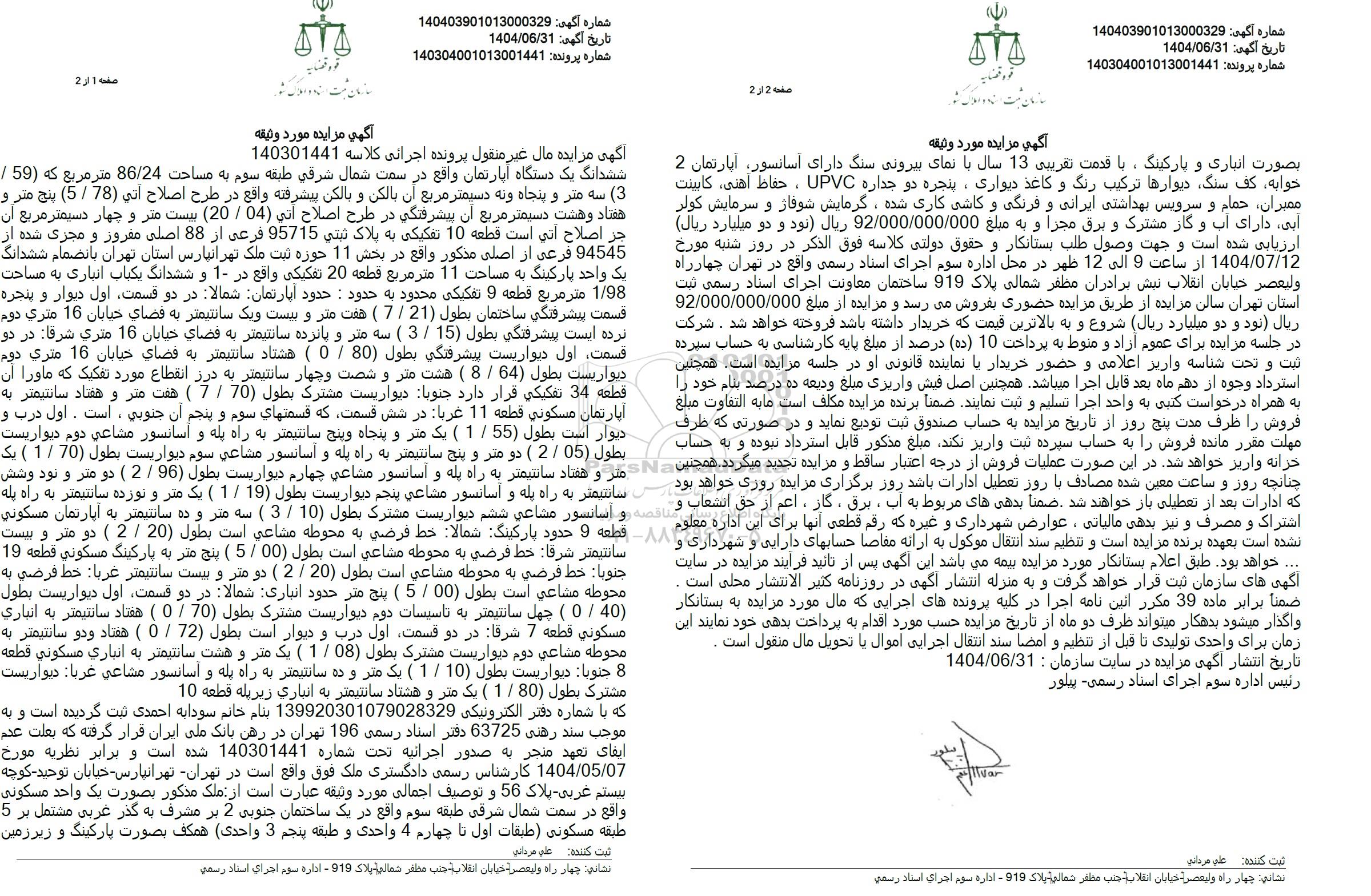 که با شماره دفتر الکترونیکی 139920301079028329 بنام خانم سودابه احمدی ثبت گردیده است و به موجب سند رهنی 63725 دفتر اسناد رسمی 196 تهران در رهن بانک ملی ایران قرار گرفته که بعلت عدم ایفای تعهد منجر به صدور اجرائیه تحت شماره 140301441 شده است و برابر نظریه مورخ 1404.05.07 کارشناس رسمی دادگستری ملک فوق واقع است در تهران تهرانپارس- خیابان توحید - کوچه بیستم غربی پلاک 56 و توصیف اجمالی مورد وثیقه عبارت است از ملک مذکور بصورت یک واحد مسکونی واقع در سمت شمال شرقی طبقه سوم واقع در یک ساختمان جنوبی 2 بر مشرف به گذر غربی مشتمل بر 5 طبقه مسکونی طبقات اول تا چهارم 4 واحدى و طبقه پنجم 3 واحدی همکف بصورت پارکینگ و زیرزمین بصورت انباری و پارکینگ با قدمت تقریبی 13 سال با نمای بیرونی سنگ دارای آسانسور آپارتمان 2 خوابه کف سنگ دیوارها ترکیب رنگ و کاغذ دیواری، پنجره دو جداره UPVC ، حفاظ آهنی، کابینت ممبران حمام و سرویس بهداشتی ایرانی و فرنگی و کاشی کاری شده ، گرمایش شوفاژ و سرمایش کولر ابی دارای آب و گاز مشترک و برق مجرا و به مبلغ 92.000.000.000 ریال نود و دو میلیارد ریال) ارزیابی شده است و جهت وصول طلب بستانکار و حقوق دولتی کلاسه فوق الذکر در روز شنبه مورخ 1404.07.12 از ساعت 9 الی 12 ظهر در محل اداره سوم اجرای اسناد رسمی واقع در تهران چهارراه ولیعصر خیابان انقلاب نبش برادران مظفر شمالی پلاک 919 ساختمان معاونت اجرای اسناد رسمی ثبت استان تهران سالن مزایده از طریق مزایده حضوری بفروش می رسد و مزایده از مبلغ 92.000.000.000 ریال نود و دو میلیارد ریال شروع و به بالاترین قیمت که خریدار داشته باشد فروخته خواهد شد. شرکت در جلسه مزایده برای عموم آزاد و منوط به پرداخت 10 (ده) درصد از مبلغ پایه کارشناسی به حساب سپرده ثبت و تحت شناسه واریز اعلامی و حضور خریدار با نماینده قانونی او در جلسه مزایده است. همچنین استرداد وجوه از دهم ماه بعد قابل اجرا میباشد. همچنین اصل فیش واریزی مبلغ ودیعه ده درصد بنام خود را به همراه درخواست کتبی به واحد اجرا تسلیم و ثبت نمایند. ضمنا برنده مزایده مکلف است ما به التفاوت مبلغ فروش را ظرف مدت پنج روز از تاریخ مزایده به حساب صندوق ثبت تودیع نماید و در صورتی که ظرف مهلت مقرر مانده فروش را به حساب سپرده ثبت واریز نکند مبلغ مذکور قابل استرداد نبوده و به حساب خزانه واریز خواهد شد. در این صورت عملیات فروش از درجه اعتبار ساقط و مزایده تجدید میگردد. همچنین چنانچه روز و ساعت معین شده مصادف با روز تعطیل ادارات باشد روز برگزاری مزایده روزی خواهد بود که ادارات بعد از تعطیلی باز خواهند شد. ضمنا بدهی های مربوط به آب، برق، گار ، اعم از حق انشعاب و اشتراک و مصرف و نیز بدهی مالیاتی، عوارض شهرداری و غیره که رقم قطعی آنها برای این اداره معلوم نشده است بعهده برنده مزایده است و تنظیم سند انتقال موکول به ارائه مقاصا حسابهای دارایی و شهرداری و زمان برای واحدی تولیدی تا قبل از تنظیم و امضا سند انتقال اجرایی اموال با تحویل مال منقول است . تاریخ انتشار آگهی مزایده در سایت سازمان : 1404.06.31 رئیس اداره سوم اجرای اسناد رسمی پیلور خواهد بود. طبق اعلام بستانکار مورد مزایده بیمه میباشد این آگهی پس از تائید فرایند مزایده در سایت آگهی های سازمان ثبت قرار خواهد گرفت و به منزله انتشار آگهی در روزنامه کثیر الانتشار محلی است . ضمنا برابر ماده 39 مکرر ایین نامه اجرا در کلیه پرونده های اجرایی که مال مورد مزایده به بستانکار واگذار میشود بدهکار میتواند ظرف دو ماه از تاریخ مزایده حسب مورد اقدام به پرداخت بدهی خود نمایند این