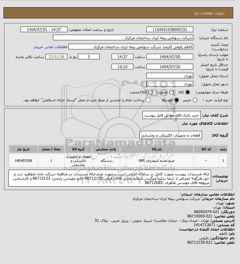 شرح کلی نیاز: خرید باتری ups مطابق فایل پیوست