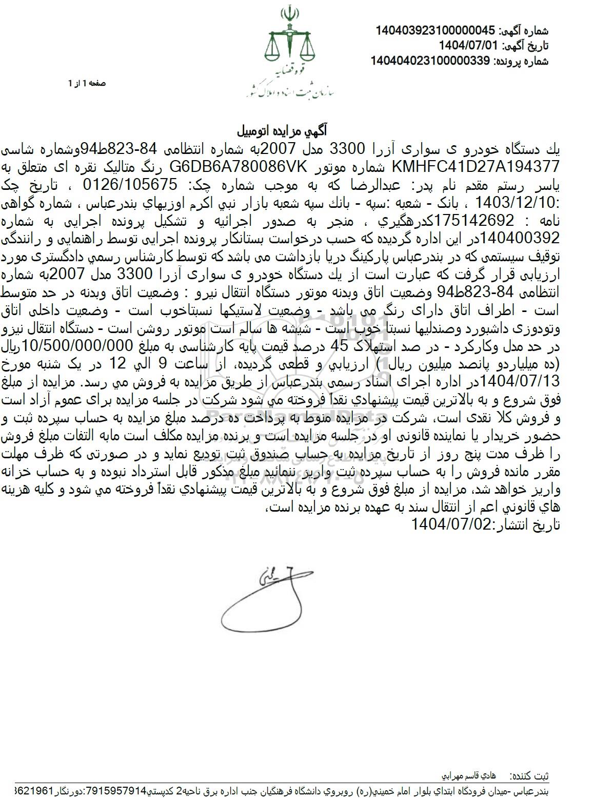 یک دستگاه خودروی سواری آزرا 3300 مدل 2007 به شماره انتظامی 84-94823 و شماره شاسی رنگ متالیک نقره ای متعلق به G6DB6A780086VK شماره موتور KMHFC41D27A194377 یاسر رستم مقدم نام پدر عبدالرضا که به موجب شماره :چک 0126/105675 ، تاریخ چک :1403.12.10 ، بانک - شعبه : سپه - بانک سپه شعبه بازار نبی اکرم اوزیهای بندر عباس ، شماره گواهی نامه : 175142692 کدرهگیری ، منجر به صدور اجرائیه و تشکیل پرونده اجرایی به شماره 140400392 در این اداره گردیده که حسب درخواست بستانکار پرونده اجرایی توسط راهنمایی و رانندگی توقیف سیستمی که در بندر عباس پارکینگ دریا بازداشت میباشد که توسط کارشناس رسمی دادگستری مورد ارزیابی قرار گرفت که عبارت است از یک دستگاه خودروی سواری آزرا 3300 مدل 2007 به شماره انتظامی 84-94823 وضعیت اتاق و بدنه موتور دستگاه انتقال نیرو : وضعیت اتاق و بدنه در حد متوسط است - اطراف اتاق دارای رنگ میباشد - وضعیت لاستیکها نسبتا خوب است - وضعیت داخلی اتاق و تو دوزی داشبورد و صندلی ها نسبتا خوب است - شیشه ها سالم است موتور روشن است - دستگاه انتقال نیزو در حد مدل و کار کرد - در صد استهلاک 45 درصد قیمت پایه کارشناسی به مبلغ 10.500.000.000 ریال ده میلیارد و پانصد میلیون ریال ( ارزیابی و قطعی گردیده از ساعت 9 الی 12 در یک شنبه مورخ 1404.07.13 در اداره اجرای اسناد رسمی بندرعباس از طریق مزایده به فروش میرسد. مزایده از مبلغ فوق شروع و به بالاترین قیمت پیشنهادی نقدا فروخته می شود شرکت در جلسه مزایده برای عموم آزاد است. و فروش کلا نقدی است شرکت در مزایده منوط به پرداخت ده درصد مبلغ مزایده به حساب سپرده ثبت و حضور خریدار یا نماینده قانونی او در جلسه مزایده است و برنده مزایده مکلف است ما به التفات مبلغ فروش را ظرف مدت پنج روز از تاریخ مزایده به حساب صندوق ثبت تودیع نماید و در صورتی که ظرف مهلت مقرر مانده فروش را به حساب سپرده ثبت واریز ننمائید مبلغ مذکور قابل استرداد نبوده و به حساب خزانه واریز خواهد شد مزایده از مبلغ فوق شروع و به بالاترین قیمت پیشنهادی نقدا فروخته می شود و کلیه هزینه های قانونی اعم از انتقال سند به عهده برنده مزایده است.