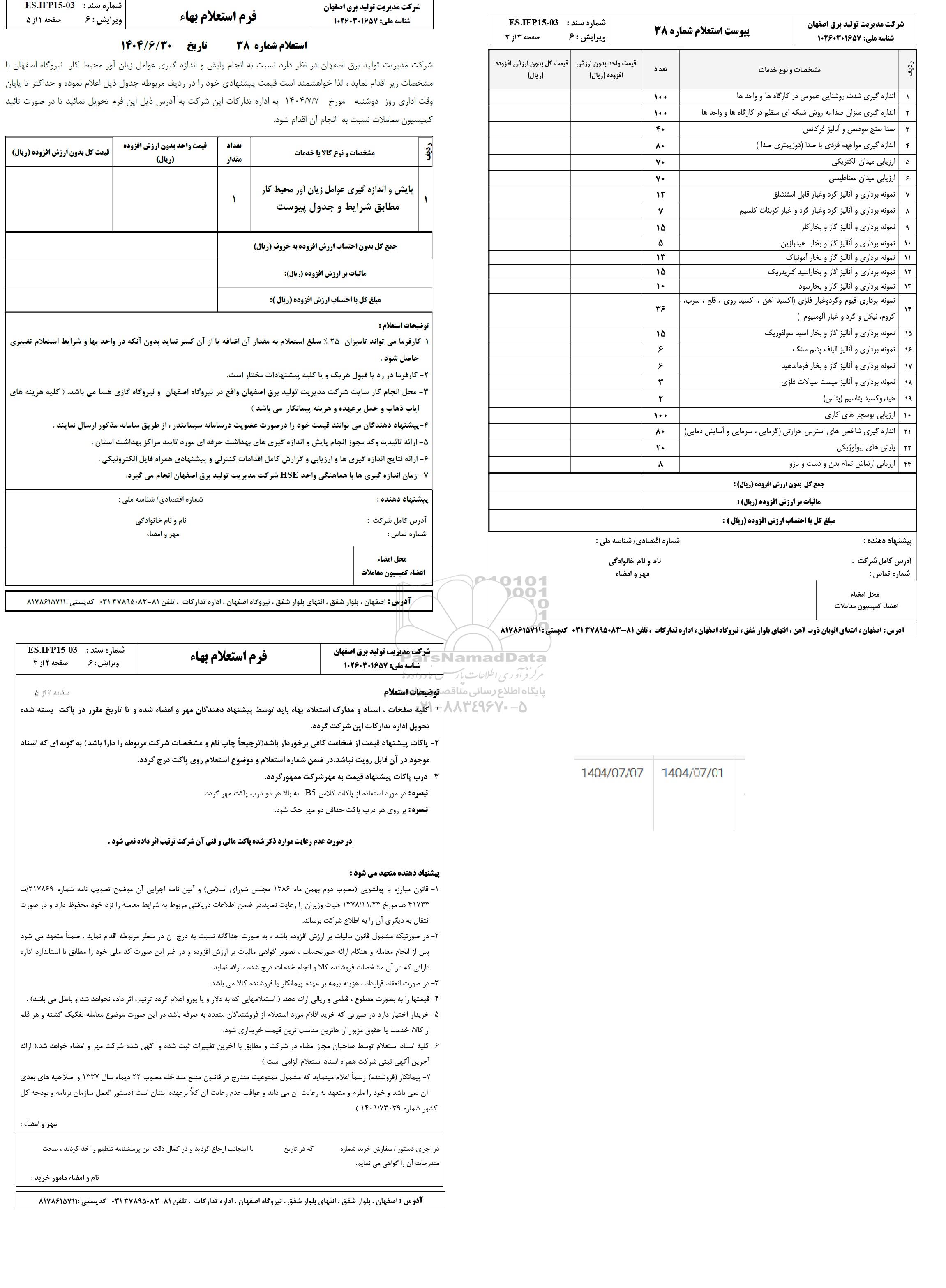 شرکت مدیریت تولید برق اصفهان در نظر دارد نسبت به انجام پایش و اندازه گیری عوامل زبان اور محیط کار نیروگاه اصفهان با مشخصات زیر اقدام نماید، لذا خواهشمت است قیمت پیشنهادی خود را در ردیف مربوطه جدول ذیل اعلام نموده و حداکثر تا پایان وقت اداری در دوشنبه مورخ 1404.7.7 به اداره تدارکات این شرکت به آدرس ذیل این فرم تحویل نمائید تا در صورت کلید کمون معاملات است به انجام آن اقدام شود.