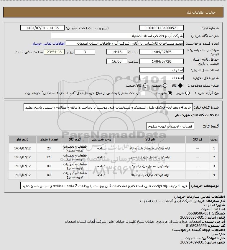 شرح کلی نیاز: خرید 4 ردیف لوله فولادی طبق استعلام و مشخصات فنی پیوست با پرداخت 2 ماهه - مطالعه و سپس پاسخ دهید