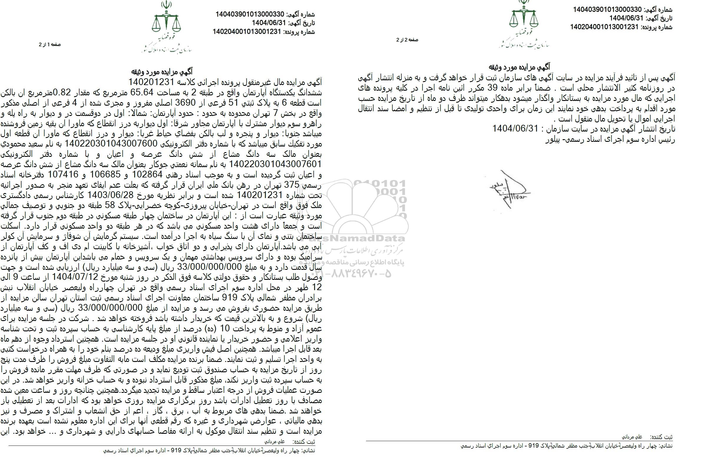اگهی مزایده مال غیر منقول پرونده اجرائی کلاسه 140201231 ششدانگ یکدستگاه آپارتمان واقع در طبقه 2 به مساحت 65.64 متر مربع که مقدار 0.82 متر مربع ان بالكن است قطعه 6 به پلاک ثبتی 51 فرعی از 3690 اصلی مفروز و مجری شده از 4 فرعی از اصلی مذکور واقع در بخش 7 تهران محدوده به حدود : حدود آپارتمان شمالا اول در دو قسمت در و دیوار به راه پله و راهرو سوم دیوار مشترک با اپارتمان مجاور شرقا اول دیوار به درز انقطاع که ماورا آن بقیه زمین فروشنده میباشد جنوبا دیوار و پنجره و لب بالكن بفضاي حياط غربا دیوار و درز انقطاع که ماورا آن قطعه اول مورد تفكيك سابق میباشد که با شماره دفتر الکترونیکی 140220301043007600 به نام سعید محمودی بعنوان مالک سه دانگ مشاع از شش دانگ عرصه و اعیان و با شماره دفتر الکترونیکی 140220301043007601 به نام سمانه نعمتی جوکار بعنوان مالک سه دانگ مشاع از شش دانگ عرصه و اعیان ثبت گردیده است و به موجب استاد رهنی 102864 و 106685 و 107416 دفترخانه اسناد رسمي 375 تهران در رهن بانک ملی ایران قرار گرفته که بعلت عدم ایفای تعهد منجر به صدور اجرائیه تحت شماره 140201231 شده است و برابر نظریه مورخ 1403.06.28 کارشناس رسمی دادگستری ملک فوق واقع است در تهران - خیابان پیروزی - کوچه خضرایی - پلاک 58 طبقه دو جنوبی و توصیف جمالي مورد وثیقه عبارت است از این آپارتمان در ساختمان چهار طبقه مسکونی در طبقه دوم جنوب قرار گرفته است و جمعاً دارای هشت واحد مسکونی می باشد که در هر طبقه دو واحد مسکونی قرار دارد. اسکلت ساختمان بتنی و نمای آن با سنگ سیاه به اجرا درآمده است. سیستم گرمایش آن شوفاز و سرمایش آن کولر آبی می باشد. آپارتمان دارای پذیرایی و دو اتاق خواب اشپز خانه با کابینت ام دی اف و کف آپارتمان از سرامیک بوده و دارای سرویس بهداشتی مهمان و یک سرویس و حمام می باشد این آپارتمان بیش از پانزده سال قدمت دارد و به مبلغ 33.000.000.000 ريال سی و سه میلیارد ریال ارزیابی شده است و جهت وصول طلب بستانکار و حقوق دولتی کلاسه فوق الذکر در روز شنبه مورخ 1404.07.12 از ساعت 9 الی 12 ظهر در محل اداره سوم اجرای اسناد رسمی واقع در تهران چهارراه ولیعصر خیابان انقلاب نیش برادران مظفر شمالی پلاک 919 ساختمان معاونت اجرای اسناد رسمی ثبت استان تهران سالن مزایده از طریق مزایده حضوری بفروش میرسد و مزایده از مبلغ 33.000.000.000 ريال سی و سه میلیارد ریال شروع و به بالاترین قیمت که خریدار داشته باشد فروخته خواهد شد. شرکت در جلسه مزایده برای عموم آزاد و منوط به پرداخت 10 (ده) درصد از مبلغ پایه کارشناسی به حساب سپرده ثبت و تحت شناسه واریز اعلامی و حضور خریدار با نماینده قانونی او در جلسه مزایده است. همچنین استرداد وجوه از دهم ماه بعد قابل اجرا میباشد. همچنین اصل فیش واریزی مبلغ ودیعه ده درصد بنام خود را به همراه درخواست کتبی به واحد اجرا تسلیم و ثبت نمایند. ضمناً برنده مزایده مکلف است مابه التفاوت مبلغ فروش را ظرف مدت پنج روز از تاریخ مزایده به حساب صندوق ثبت تودیع نماید و در صورتی که ظرف مهلت مقرر مانده فروش را به حساب سپرده ثبت واریز نکند مبلغ مذکور قابل استرداد نبوده و به حساب خزانه واریز خواهد شد. در این صورت عملیات فروش از درجه اعتبار ساقط و مزایده تجدید میگردد. همچنین چنانچه روز و ساعت معین شده مصادف با روز تعطیل ادارات باشد روز برگزاری مزایده روزی خواهد بود که ادارات بعد از تعطیلی باز خواهند شد. صمنا بدهی های مربوط به آب . برق ، گاز ، اعم از حق انشعاب و اشتراک و مصرف و نیز بدهی مالیاتی، عوارض شهرداری و غیره که رقم قطعی آنها برای این اداره معلوم نشده است بعهده برنده مزایده است و تنظیم سند انتقال موکول به ارائه مفاصا حسابهای دارایی و شهرداری و .... خواهد بود.