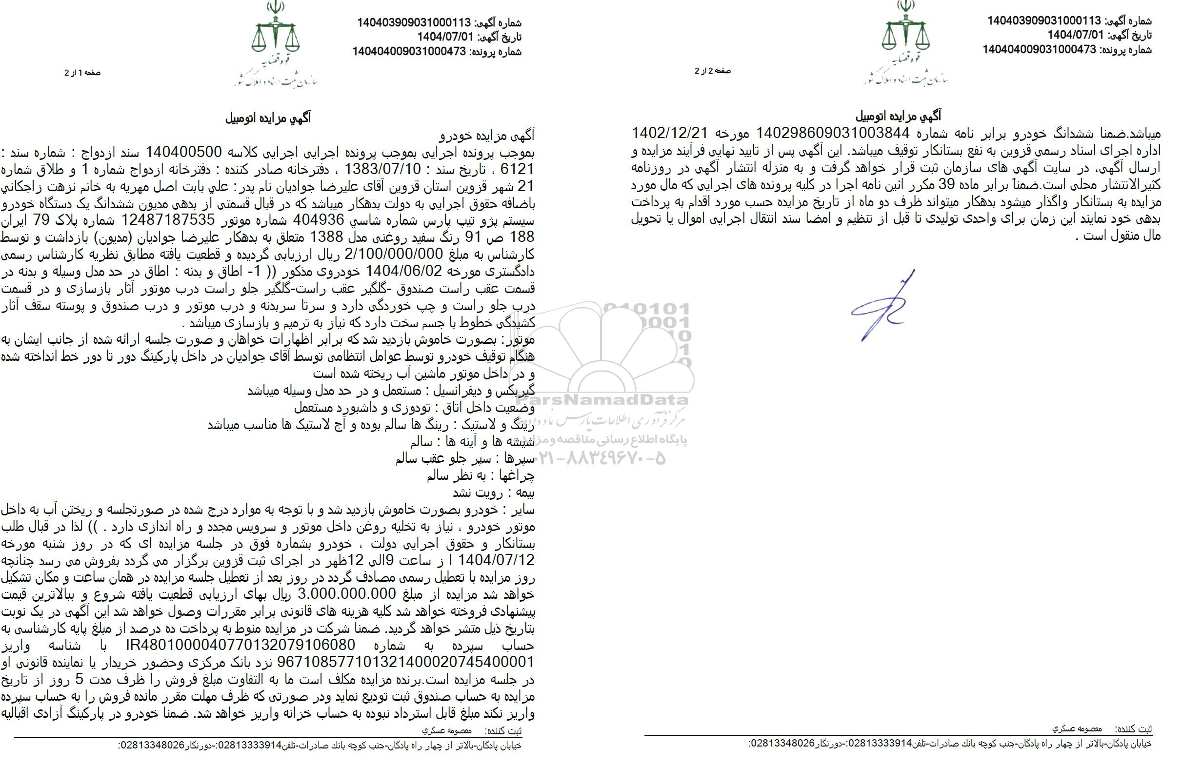 بموجب پرونده اجرایی بموجب پرونده اجرایی اجرایی کلاسه 140400500 سند ازدواج : شماره سند : 6121 ، تاریخ سند : 1383.07.10 ، دفترخانه صادر کننده : دفترخانه ازدواج شماره 1 و طلاق شماره 21 شهر قزوین استان قزوین آقای علیرضا جوادیان نام پدر علی بابت اصل مهریه به خانم نزهت زاجكاني باضافه حقوق اجرایی به دولت بدهکار میباشد که در قبال قسمتی از بدهی مدیون ششدانگ یک دستگاه خودرو سیستم پژو تیپ پارس شماره شاسي 404936 شماره موتور 12487187535 شماره پلاک 79 ایران 188 ص 91 رنگ سفید روغنی مدل 1388 متعلق به بدهکار علیرضا جوادیان (مدیون) بازداشت و توسط کارشناس به مبلغ 2.100.000.000 ریال ارزیابی گردیده و قطعیت یافته مطابق نظریه کارشناس رسمی دادگستری مورخه 1404.06.02 خودروی مذکور (1- اطاق و بدنه : اطاق در حد مدل وسیله و بدنه در قسمت عقب راست صندوق گلگیر عقب راست گلگیر جلو راست درب موتور آثار بازسازی و در قسمت درب جلو راست و چپ خوردگی دارد و سرتا سر بدنه و درب موتور و درب صندوق و پوسته سقف آثار کشیدگی خطوط با جسم سخت دارد که نیاز به ترمیم و بازسازی میباشد.