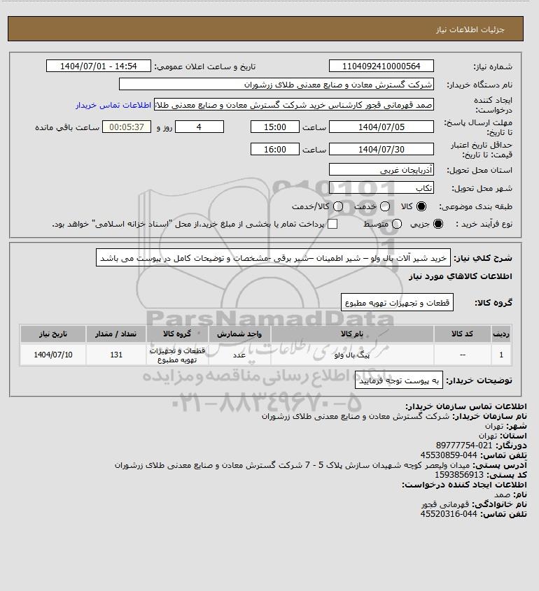 نام دستگاه خریدار:شرکت گسترش معادن و صنایع معدنی طلای زرشوران