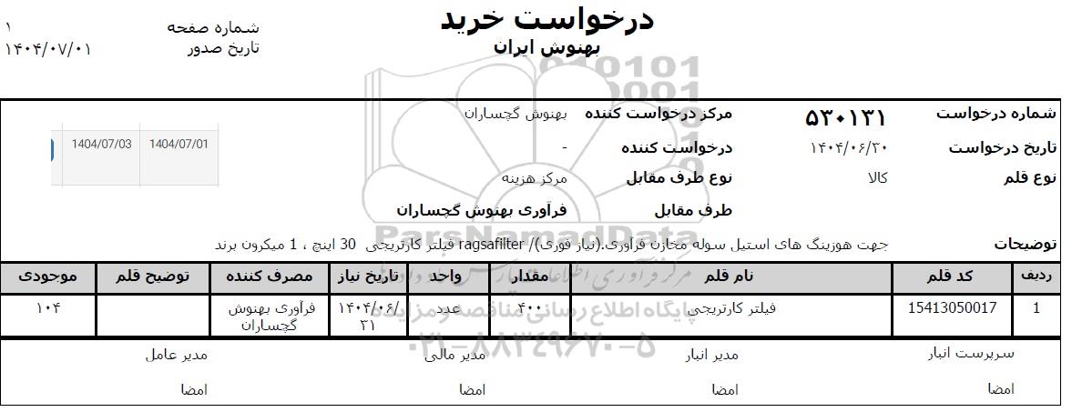 استعلام بها و موضوع استعلام استعلام فیلتر کارتریجی به اطلاع کلیه شرکتها و افراد متخصص واجد شرایط میرساند، آگهی گذار در نظر دارد از طریق استعلام بها، نسبت به انتخاب و دریافت پیشنهادات اقدام نماید. این استعلام با کد آگهی ثبت شده در سامانه خبرگزاری پارس نماد : 9591367 منتشر شده است. مشخصات استعلام : تاریخ شروع استعلام: 1404/07/01 آخرین مهلت ارسال پیشنهاد قیمت : 1404/07/03 و محل اجرای پروژه : استان سایر میباشد. استعلام قیمت مورد درخواست : استعلام فیلتر کارتریجی با دستهبندیهای تخصصی و گروه های مرتبط : انواع فیلتر های تصفیه, ماشین آلات صنایع غذایی، دارویی و شیمیایی, تجهیزات و ماشین آلات صنعتی, استعلام اطلاع رسانی میگردد. شرایط شرکت در استعلام آنلاین : ابتدا ثبت نام در سامانه استعلام پارس نماد و تکمیل مدارک موردنیاز و بارگذاری در سامانه رعایت تمامی ضوابط و الزامات مندرج در اسناد استعلام است.
