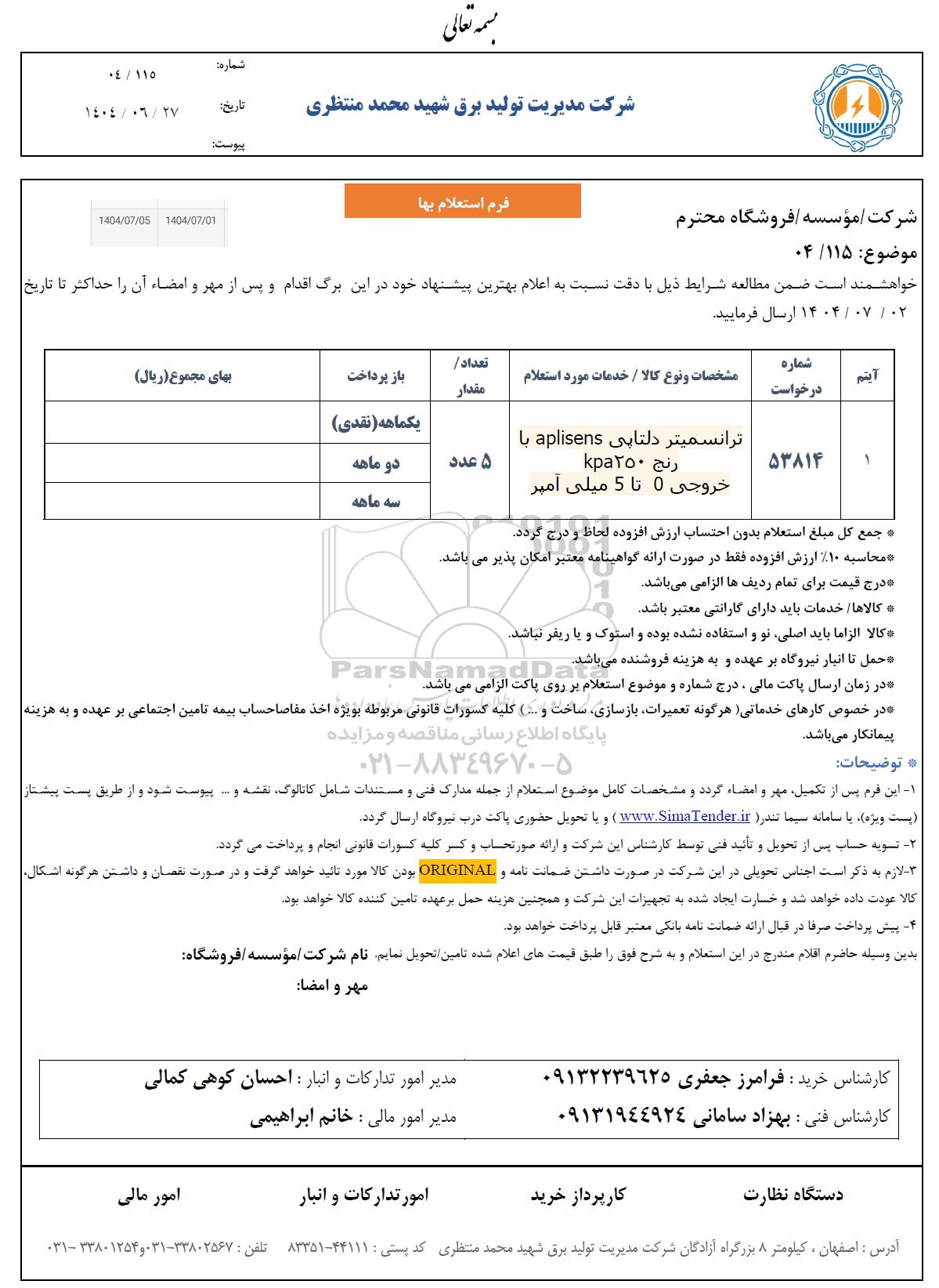 1- این فرم پس از تکمیل مهر و امضاء گردد و مشخصات کامل موضوع استعلام از جمله مدارک فنی و مستندات شامل کاتالوگ نقشه و .... پیوست شود و از طریق پست پیشتاز (پست ویژه) با سامانه سیما تندر ( www.SimaTender.ir ) و یا تحویل حضوری پاکت درب نیروگاه ارسال گردد.