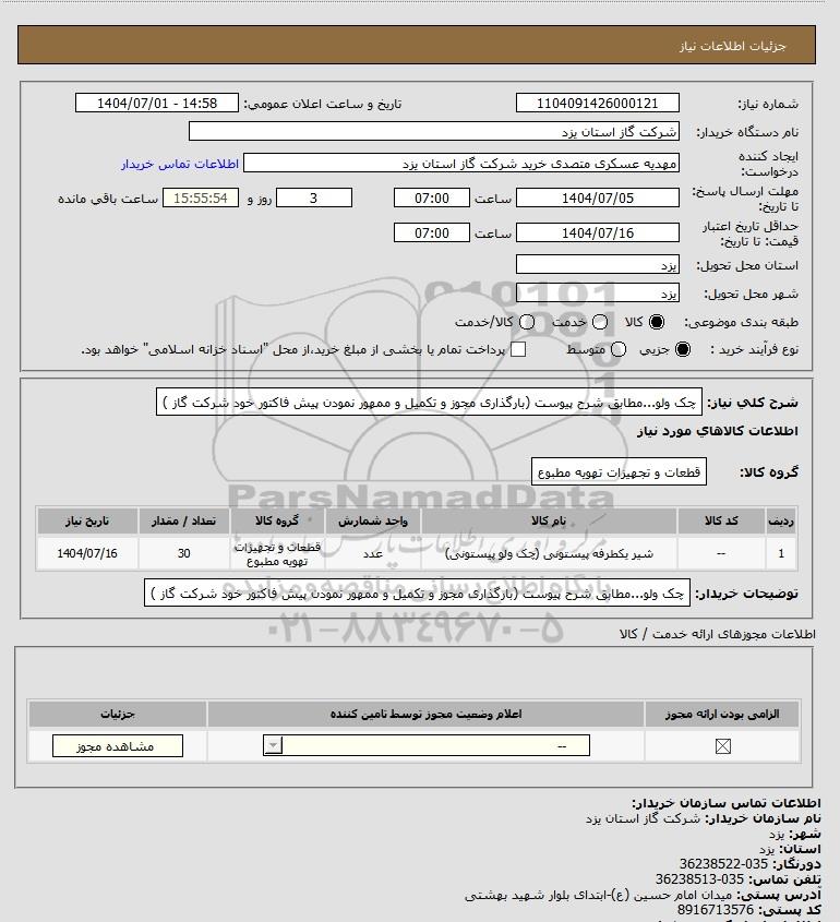 شرح کلی نیاز: چک ولو...مطابق شرح پیوست (بارگذاری مجوز و تکمیل و ممهور نمودن پیش فاکتور خود شرکت گاز )