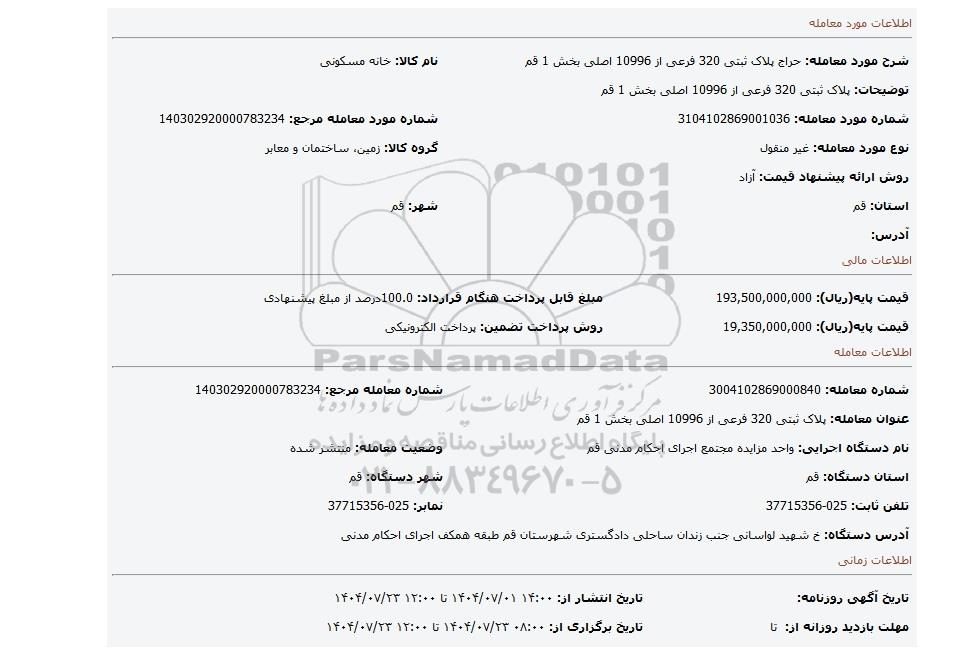 | شرح مورد معامله: حراج پلاک ثبتی 320 فرعی از 10996 اصلی بخش 1 قم | نام کالا: خانه مسکونی | |