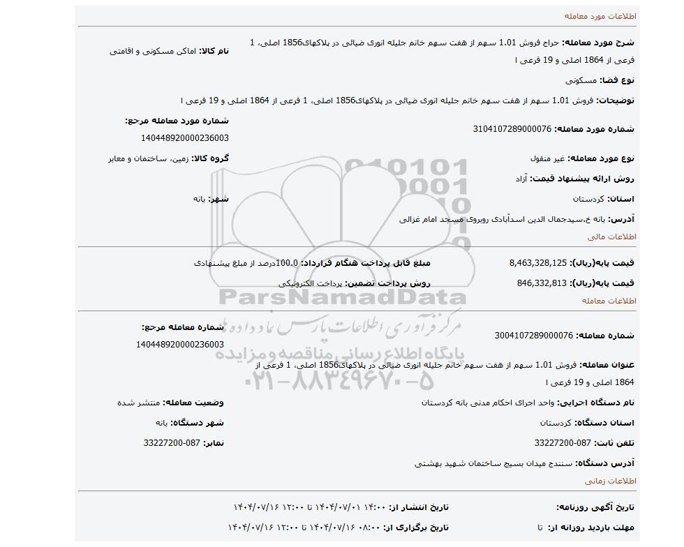 مزایده عمومی مزایده فروش 1.01 سهم از هفت سهم خانم جلیله انوری ضیائی در پلاکهای1856 اصلی 1 فرعی از 1864 اصلی و 19 فرعی ا برگزار میگردد. از کلیه افراد متخصص و شرکت‌های واجد شرایط دعوت به عمل می‌آید تا در این مزایده با کد خبرگزاری پارس نماد : 9591481 شرکت نمایند تاریخ شروع مزایده : 1404/07/01 مهلت شرکت در مزایده: تا پایان روز 1404/07/16 مکان برگزاری اموال واگذاری استان‌های کردستان و دسته‌بندی‌های مربوط به این حراجی املاک و زمین میباشد.