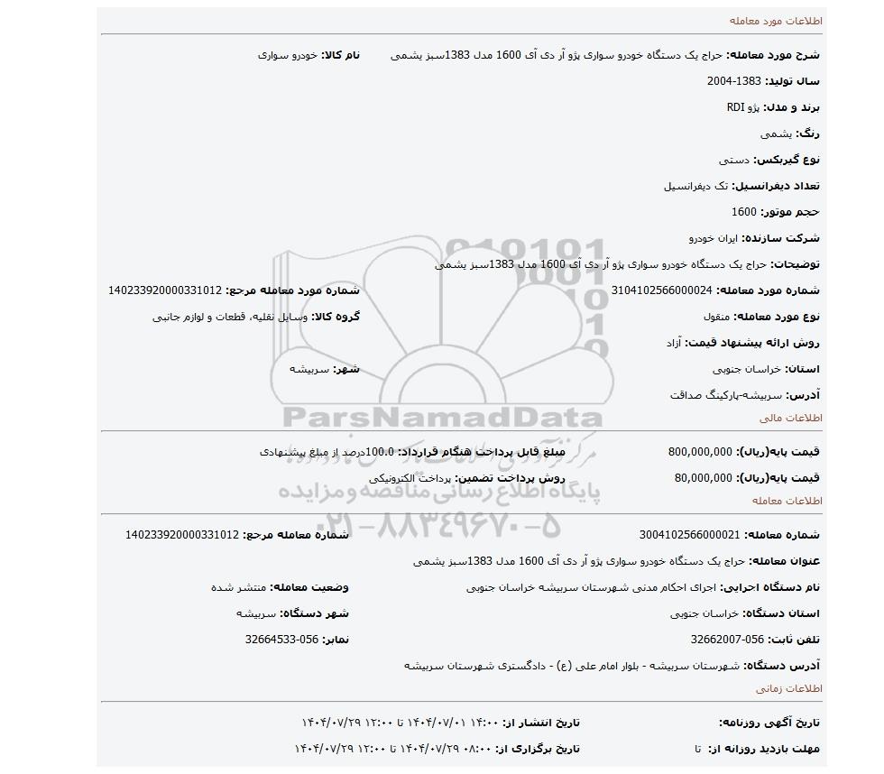 | عنوان معامله: حراج یک دستگاه خودرو سواری پژو آر دی آی 1600 مدل 1383سبز یشمی | ||