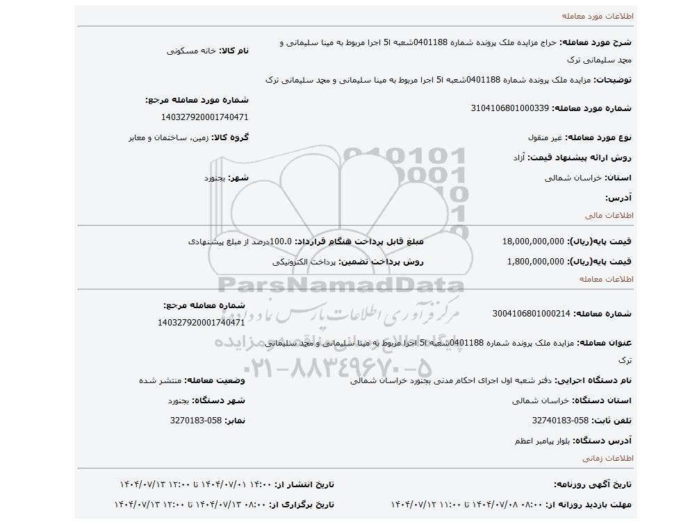 | عنوان معامله: مزایده ملک پرونده شماره 0401188شعبه ا5 اجرا مربوط به مینا سلیمانی و محمد سلیمانی ترک | ||