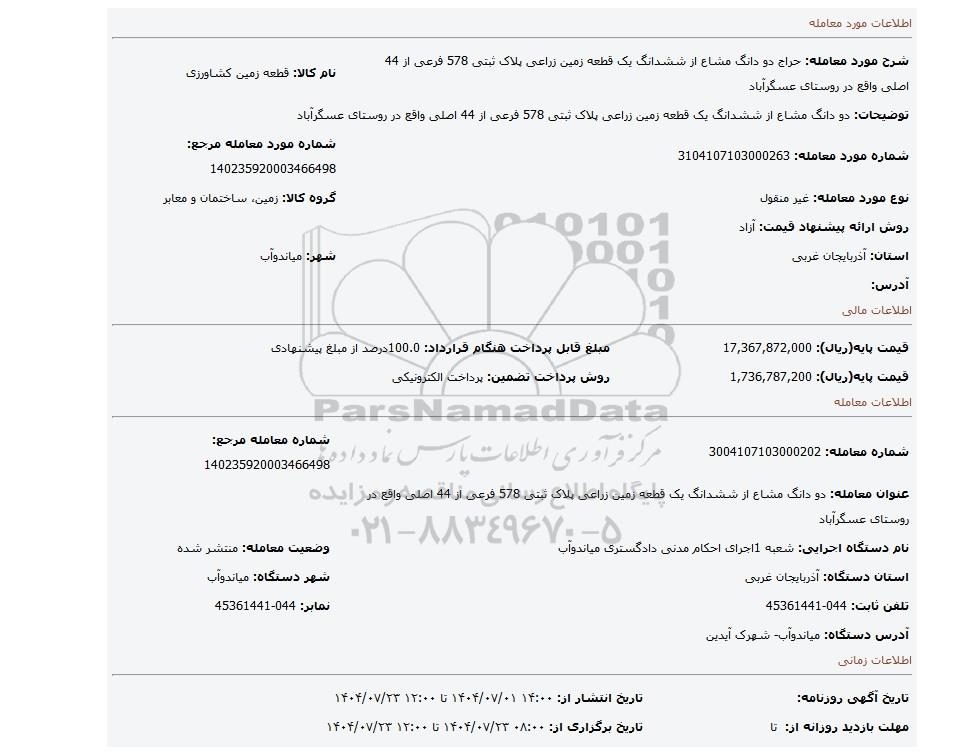 مزایده عمومی مزایده دو دانگ مشاع از ششدانگ یک قطعه زمین زراعی پلاک ثبتی 578 فرعی از 44 اصلی واقع در روستای عسگرآباد برگزار میگردد. از کلیه افراد متخصص و شرکت‌های واجد شرایط دعوت به عمل می‌آید تا در این مزایده با کد خبرگزاری پارس نماد : 9591500 شرکت نمایند تاریخ شروع مزایده : 1404/07/01 مهلت شرکت در مزایده: تا پایان روز 1404/07/23 مکان برگزاری اموال واگذاری استان‌های آذربایجان غربی و دسته‌بندی‌های مربوط به این حراجی ماشین آلات و تجهیزات کشاورزی و دام پروری, املاک و زمین میباشد.