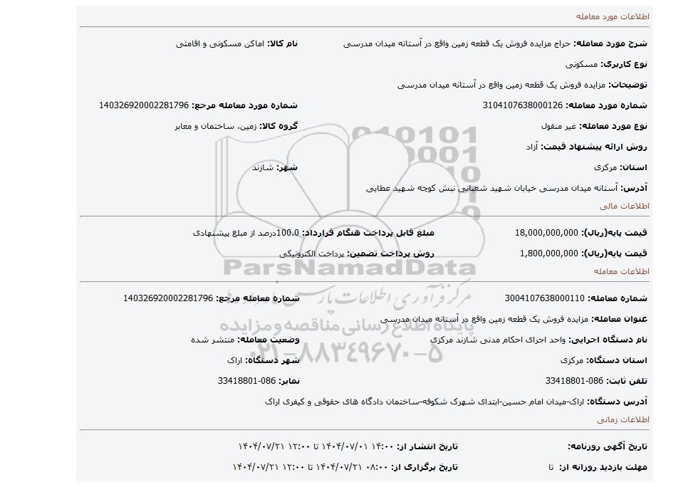 مزایده،  مزایده فروش یک قطعه زمین واقع در آستانه میدان مدرسی
