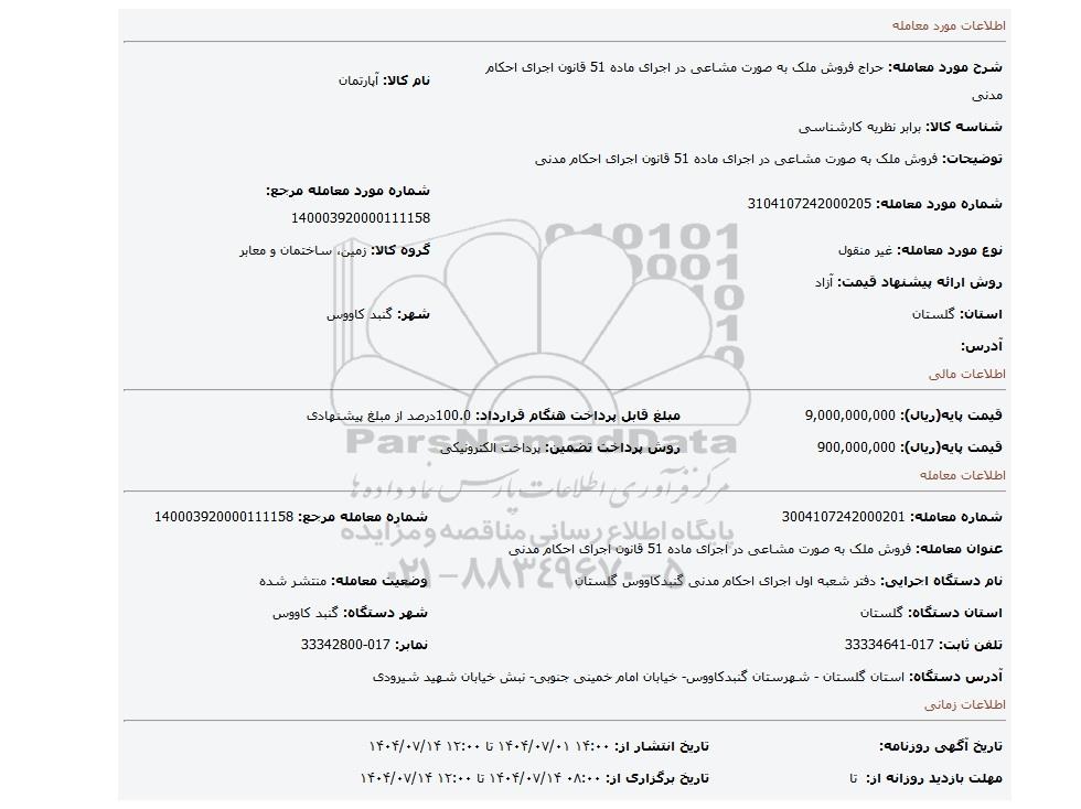 شرح مورد معامله: حراج فروش ملک به صورت مشاعی در اجرای ماده 51 قانون اجرای احکام مدنینام کالا: آپارتمان