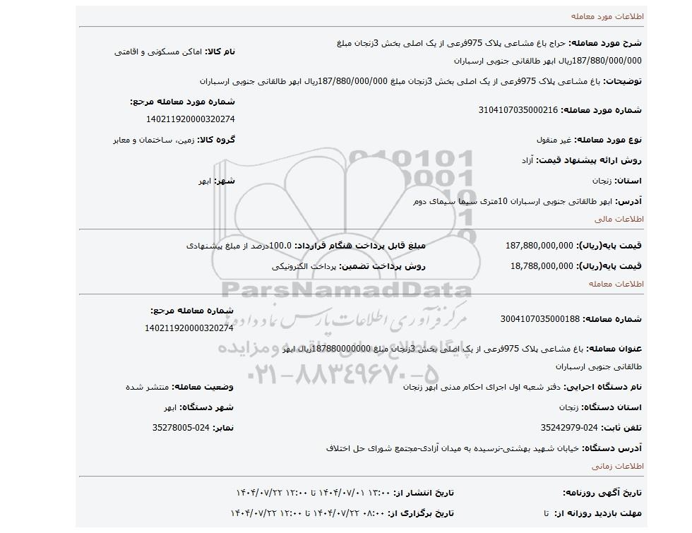 | عنوان معامله: باغ مشاعی پلاک 975فرعی از یک اصلی بخش 3زنجان مبلغ 187880000000ریال ابهر طالقانی جنوبی ارسباران | ||