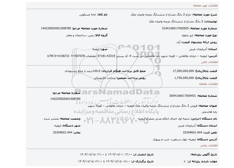 مزایده عمومی مزایده 2 دانگ مشاع از ششدانگ عرصه واعیان ملک برگزار میگردد. از کلیه افراد متخصص و شرکت‌های واجد شرایط دعوت به عمل می‌آید تا در این مزایده با کد خبرگزاری پارس نماد : 9591512 شرکت نمایند تاریخ شروع مزایده : 1404/07/01 مهلت شرکت در مزایده: تا پایان روز 1404/07/15 مکان برگزاری اموال واگذاری استان‌های آذربایجان غربی و دسته‌بندی‌های مربوط به این حراجی املاک و زمین میباشد.