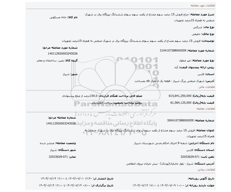 مزایده عمومی مزایده فروش 15 درصد سهم مشاع از یکصد سهم سهام ششدانگ نیروگاه برق در شهرک صنعتی به همراه 15درصد تجهیزات برگزار میگردد. از کلیه افراد متخصص و شرکت‌های واجد شرایط دعوت به عمل می‌آید تا در این مزایده با کد خبرگزاری پارس نماد : 9591514 شرکت نمایند تاریخ شروع مزایده : 1404/07/01 مهلت شرکت در مزایده: تا پایان روز 1404/07/14 مکان برگزاری اموال واگذاری استان‌های فارس و دسته‌بندی‌های مربوط به این حراجی برق, سرمایه گذاری میباشد.