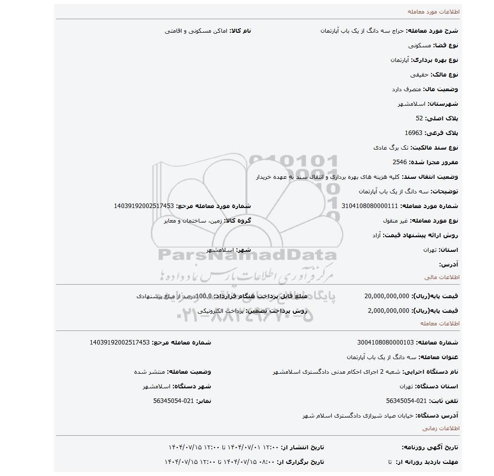 | شرح مورد معامله: حراج سه دانگ از یک باب آپارتمان | نام کالا: اماکن مسکونی و اقامتی | |