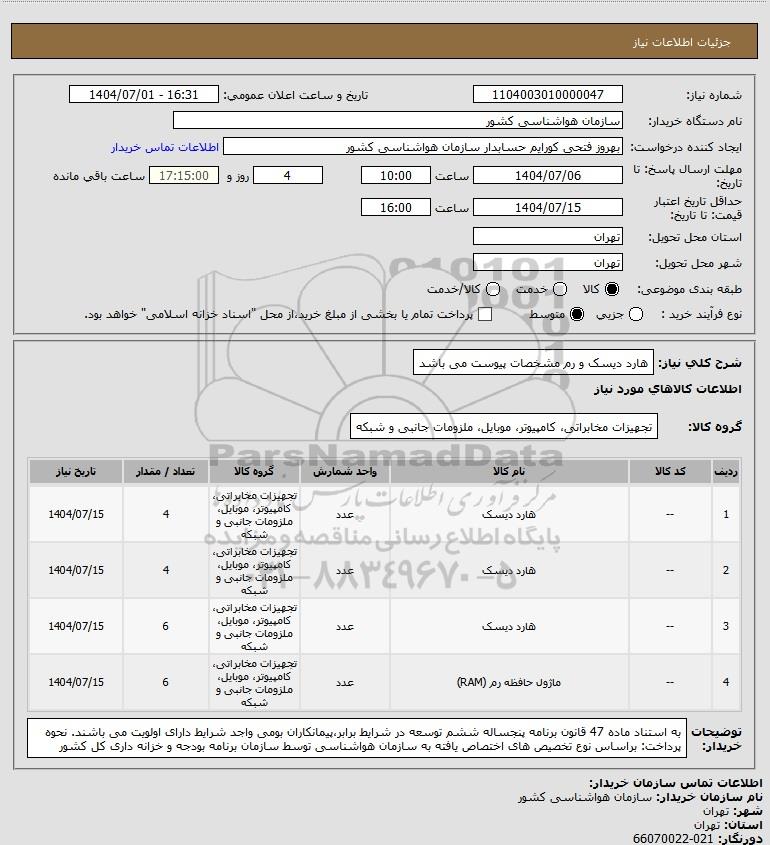 | 1 | -- | هارد دیسک | عدد | تجهیزات مخابراتی، کامپیوتر، موبایل، ملزومات جانبی و شبکه | 4 | 1404/07/15 |