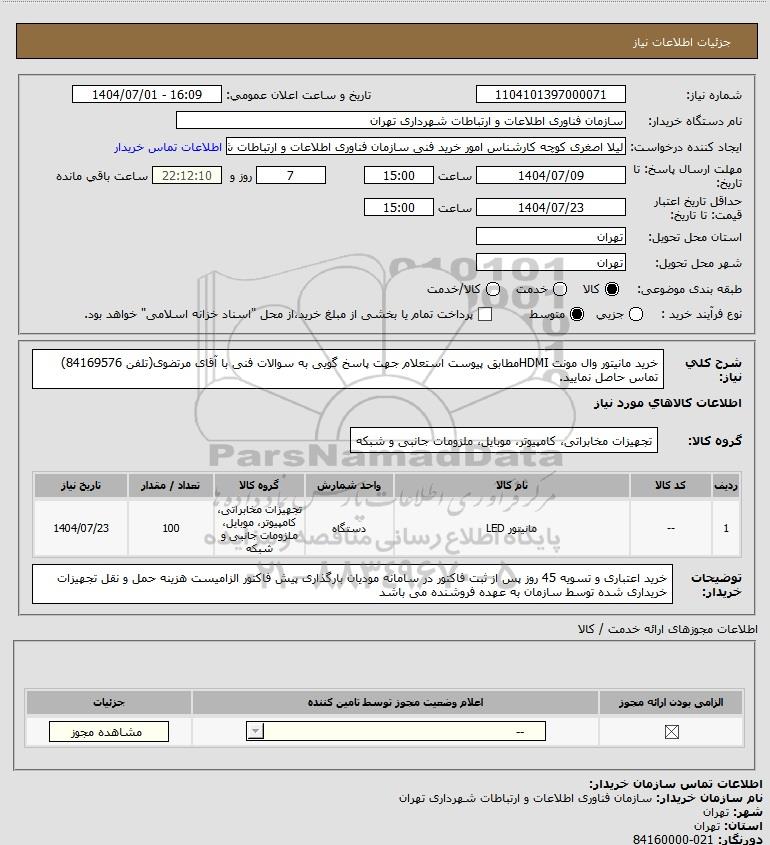 شرح کلی نیاز: خرید مانیتور وال مونت HDMIمطابق پیوست استعلام جهت پاسخ گویی به سوالات فنی با آقای مرتضوی(تلفن 84169576) تماس حاصل نمایید.