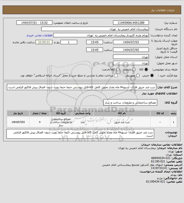 1 -- درب ضد حریق عدد مصالح ساختمانی و ملزومات ساخت و ساز 4 1404/07/05