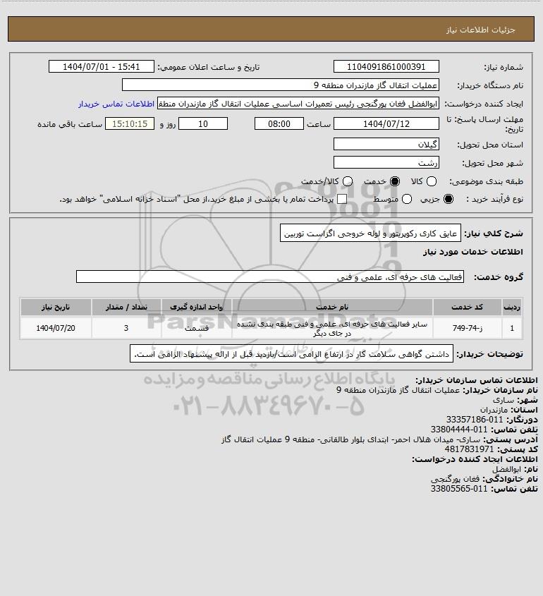 نام دستگاه خریدار:عملیات انتقال گاز مازندران منطقه 9