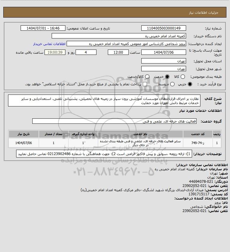 شرح کلی نیاز: نظارت بر اجرای قراردادهای موسسات آموزشی برون سپار در زمینه های تحصیلی، پشتیبانی تلفنی، استعدادیابی و سایر خدمات مرتبط دانش آموزان مورد حمایت