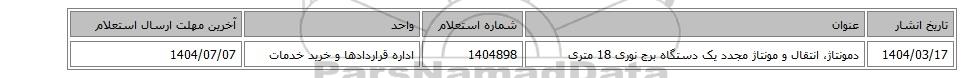 1404/03/17دمونتاژ، انتقال و مونتاژ مجدد یک دستگاه برج نوری 18 متری1404898اداره قراردادها و خرید خدمات1404/07/07