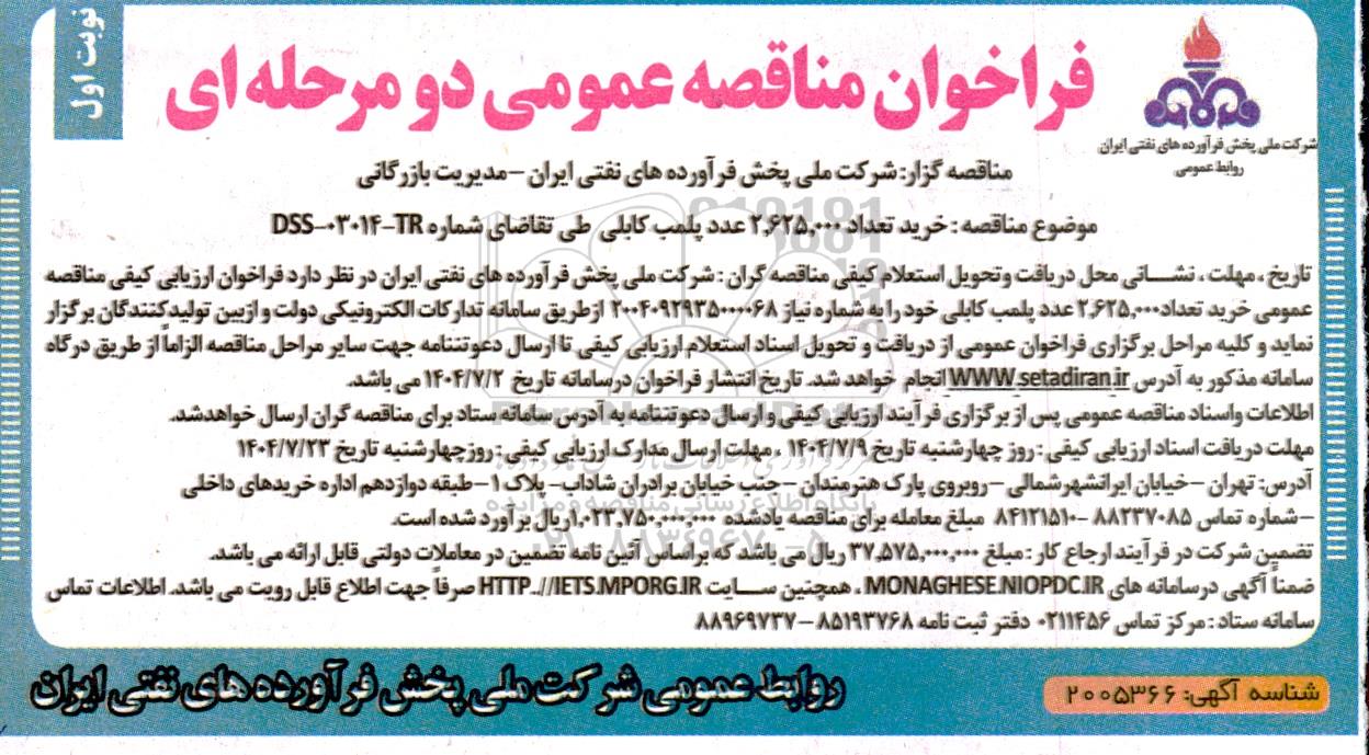 موضوع مناقصه خرید تعداد 2.625.000 عدد پلمب کابلی طی تقاضای شماره DSS-03014-TR