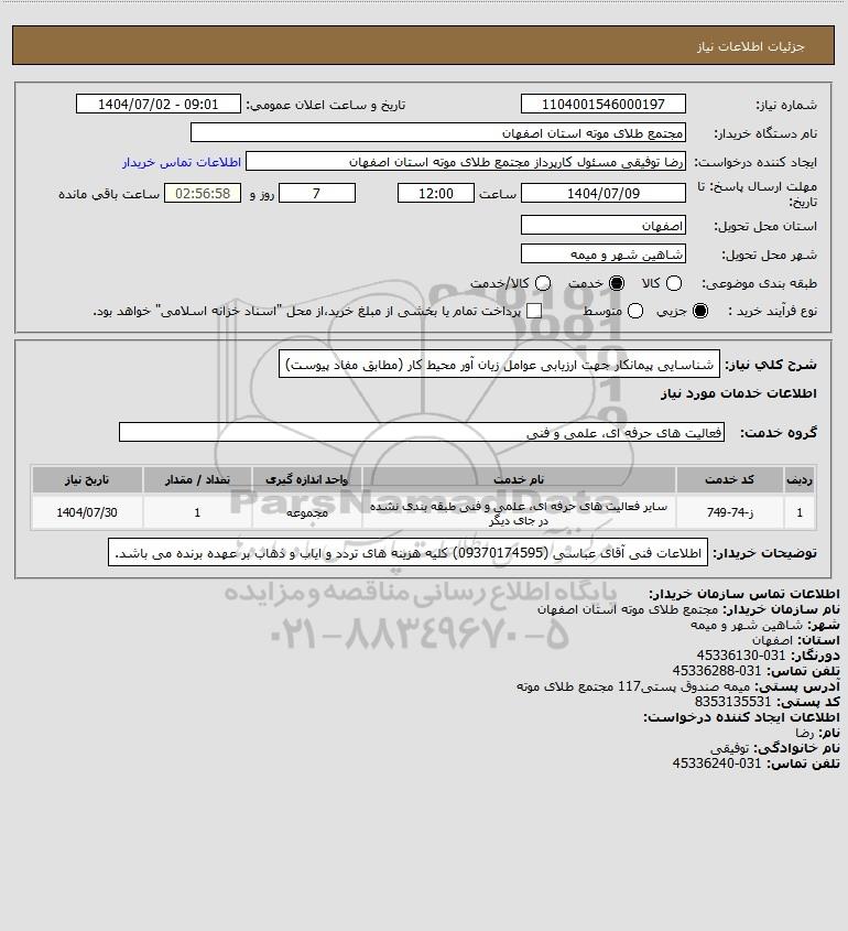 شرح کلی نیاز: شناسایی پیمانکار جهت ارزیابی عوامل زیان آور محیط کار (مطابق مفاد پیوست)