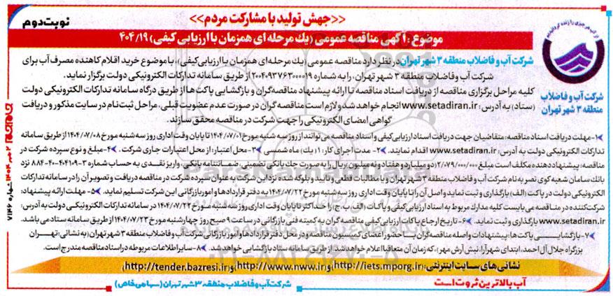 شرکت آب و فاضلاب منطقه 3 شهر تهران در نظر دارد مناقصه عمومی یک مرحله ای همزمان با ارزیابی کیفی با موضوع خرید اقلام کاهنده مصرف آب برای شرکت آب و فاضلاب منطقه 3 شهر تهران را به شماره 2004093763000019 از طریق سامانه تدارکات الکترونیکی دولت برگزار نماید.