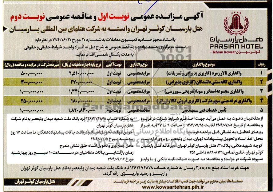 | 3 | واگذاری مجموعه استخر و سونا (تفریحی ورزشی) | مزایده عمومی | نوبت اول | 1.340.000.000 | 1.000.000.000 |