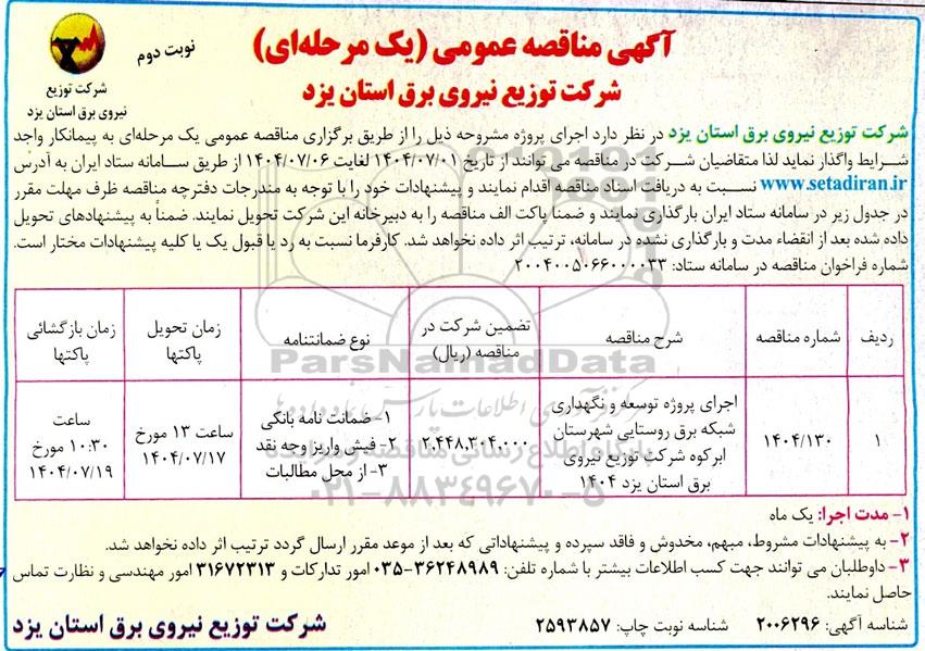 | 1 | 1404.130 | اجرای پروژه توسعه و نگهداری شبکه برق روستایی شهرستان ابرکوه شرکت توزیع نیروی برق استان یزد 1404 | 2.448.304.000 | 1- ضمانتنامه بانکی 2- فیش واریز وجه نقد 3-مطالبات |