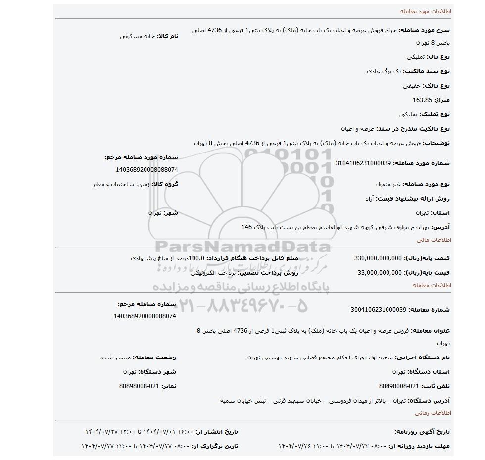 عنوان معامله: فروش عرصه و اعیان یک باب خانه (ملک) به پلاک ثبتی1 فرعی از 4736 اصلی بخش 8 تهران