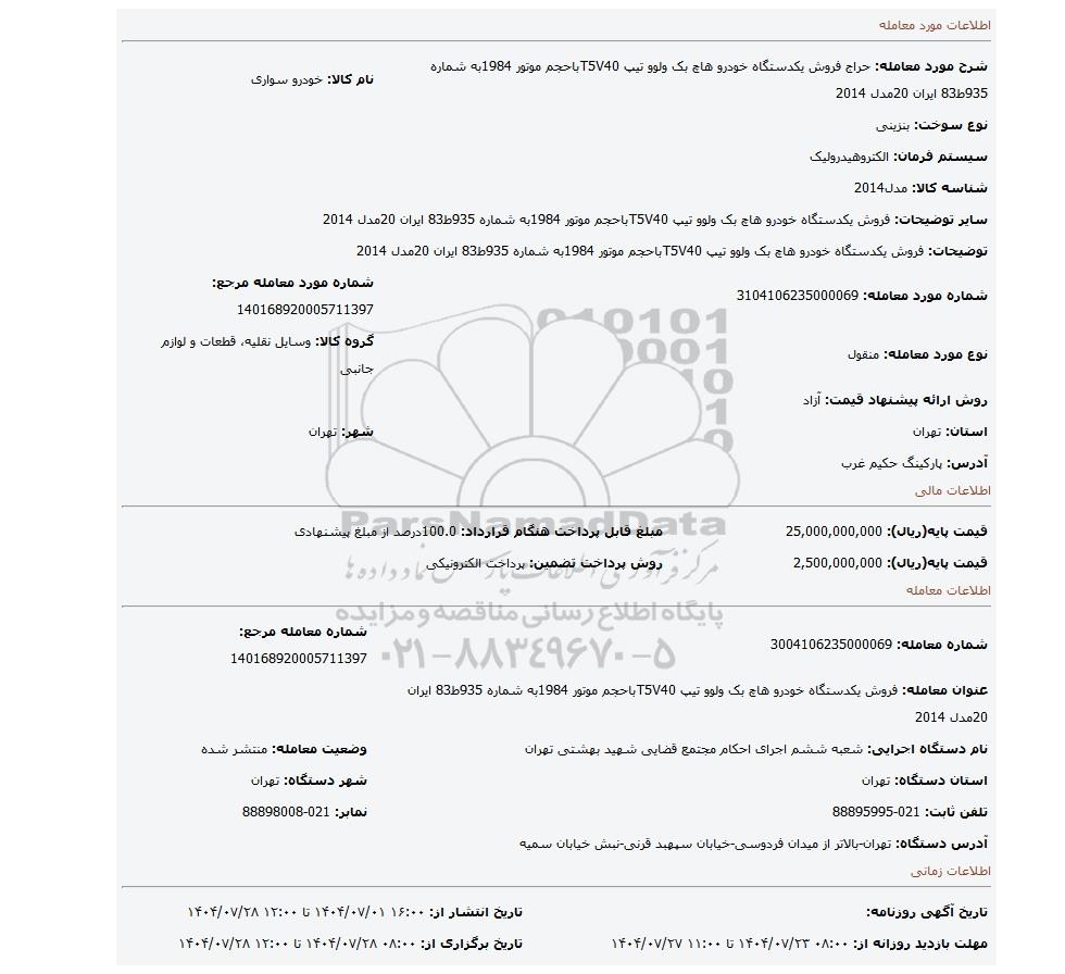 | عنوان معامله: فروش یکدستگاه خودرو هاچ بک ولوو تیپ T5V40باحجم موتور 1984به شماره 935ط83 ایران 20مدل 2014 | ||