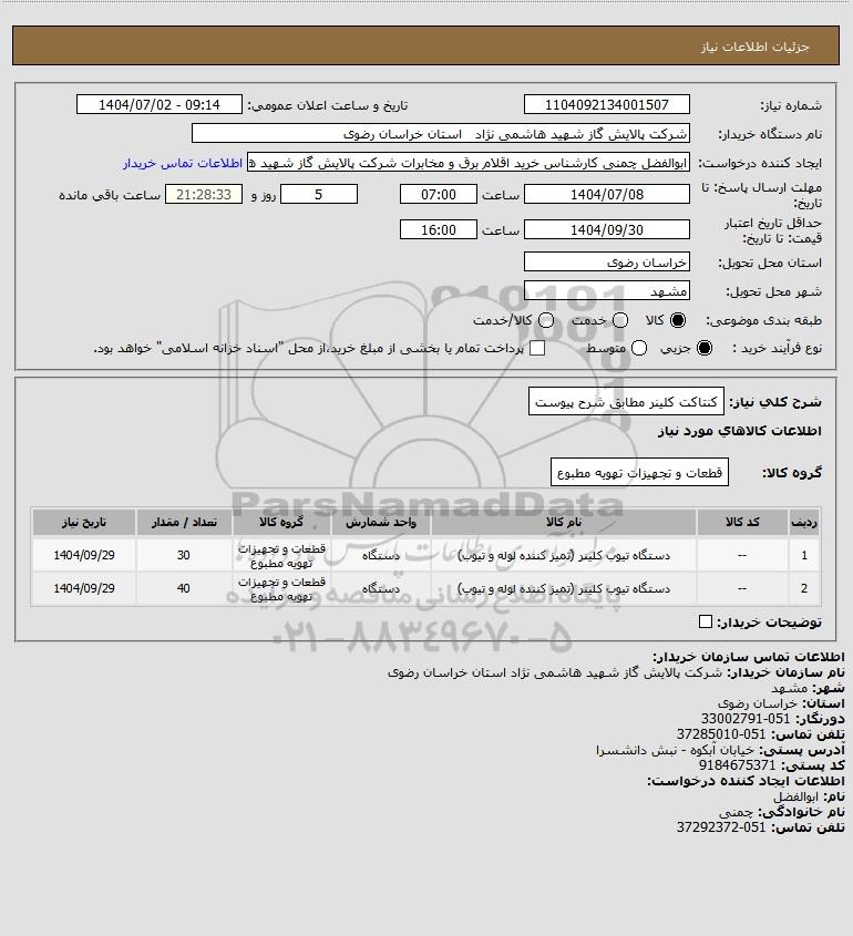استعلام کنتاکت کلینر مطابق شرح پیوست, استعلام کنتاکت کلینر مطابق شرح پیوست