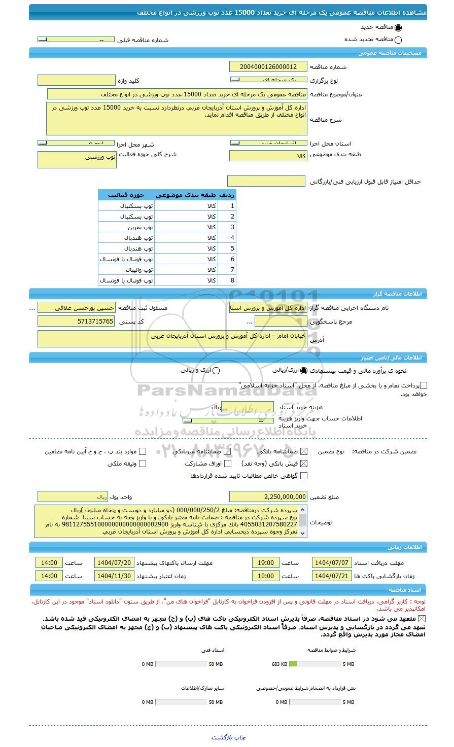 شرح مناقصهاداره کل آموزش و پرورش استان آذربايجان غربي درنظردارد نسبت به خرید 15000 عدد توپ ورزشی در انواع مختلف از طریق مناقصه اقدام نمايد.