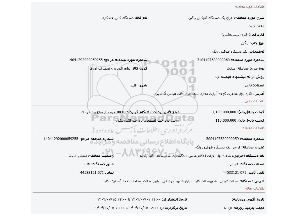 | عنوان معامله: فروش یک دستگاه فتوکپی رنگی | ||