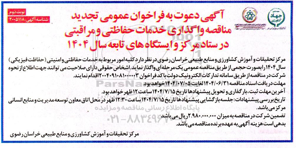 مرکز تحقیقات و آموزش کشاورزی و منابع طبیعی خراسان رضوی در نظر دارد کلیه امور مربوط به خدمات حفاظتی و امنیتی (حفاظت فیزیکی) سال 1404 را بصورت حجمی از طریق مناقصه عمومی یک مرحله ای واگذار نماید . اشخاص حقوقی دارای صلاحیت میتوانند جهت اطلاع از نحوه شرکت در مناقصه از طریق سامانه تدارکات الکترونیک دولت با کد فراخوان 2004091081000003 اقدام نمایند.