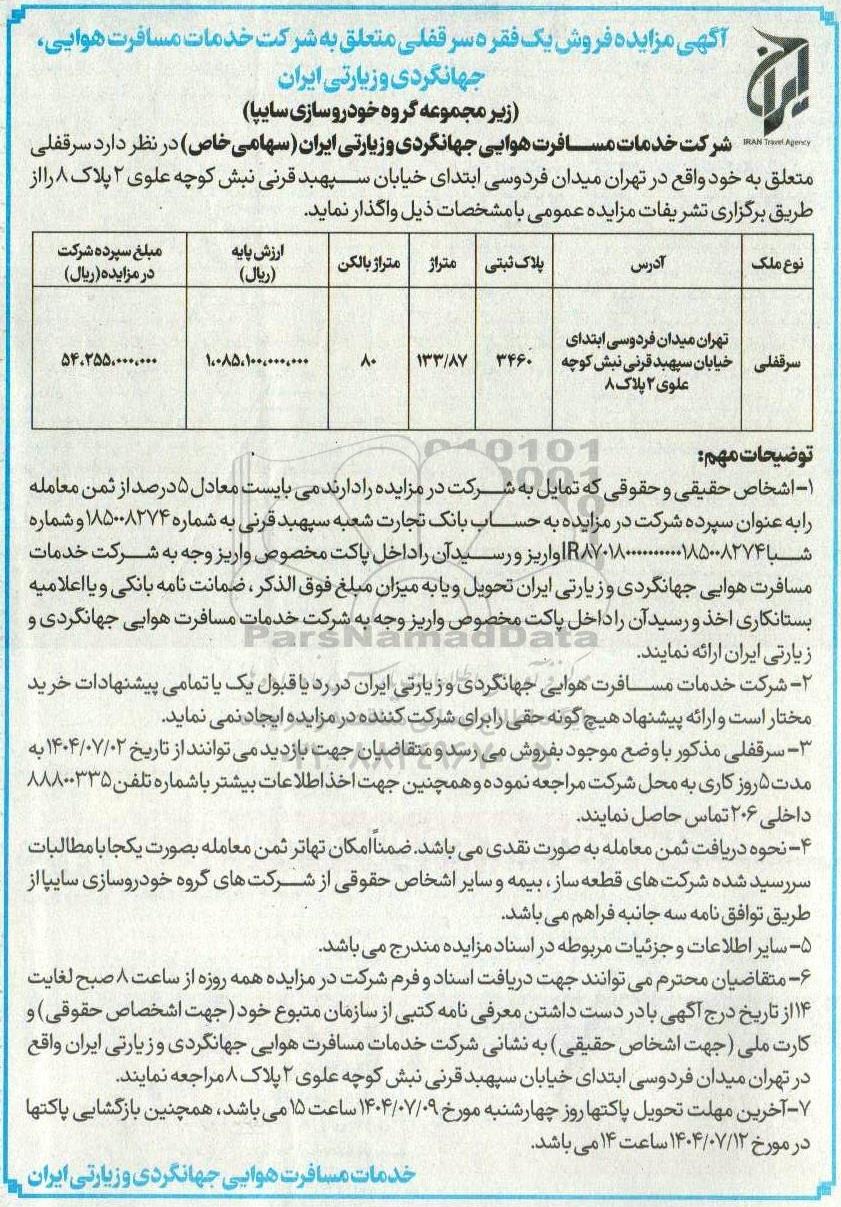 شرکت خدمات مسافرت هوایی جهانگردی و زیارتی ایران (سهامی خاص) در نظر دارد سرقفلی متعلق به خود واقع در تهران میدان فردوسی ابتدای خیابان سپهبد قرنی نبش کوچه علوی 2 پلاک 8 را از طریق برگزاری تشریفات مزایده عمومی با مشخصات ذیل واگذار نماید.