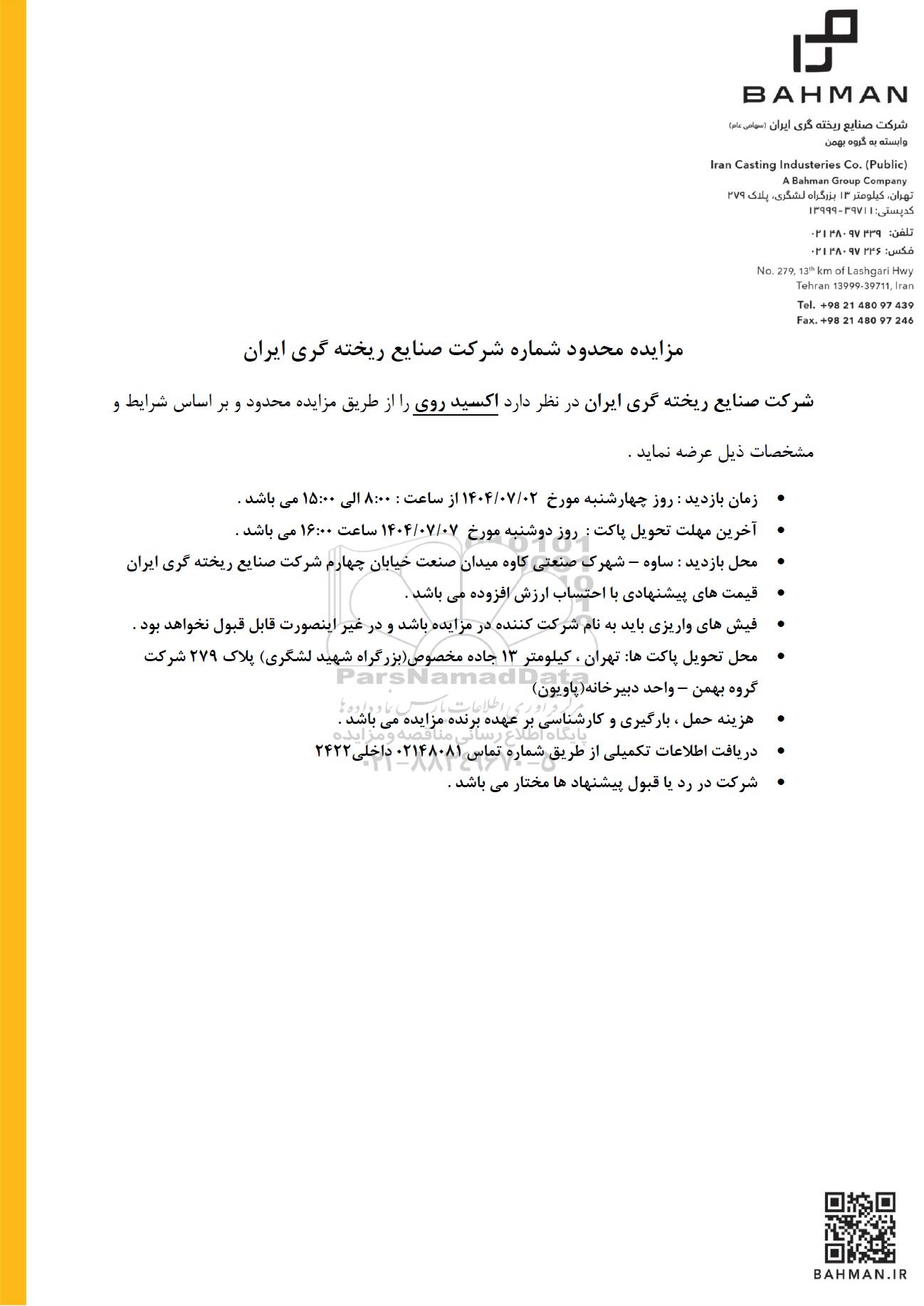 مزایده محدود شماره شرکت صنایع ریخته گری ایران