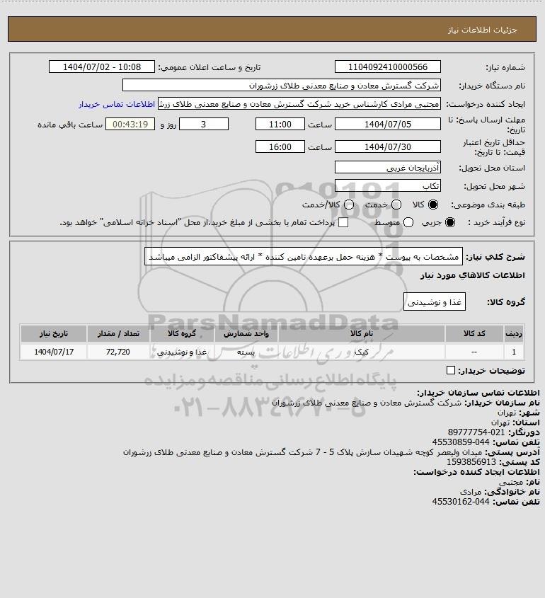 نام دستگاه خریدار:شرکت گسترش معادن و صنایع معدنی طلای زرشوران