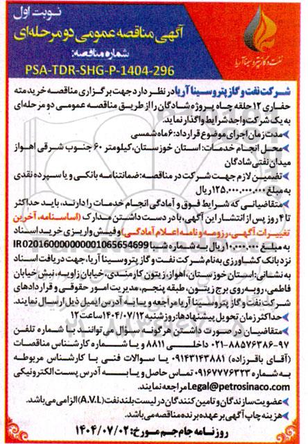 شرکت نفت و گاز پتروسینا آریا در نظر دارد جهت برگزاری مناقصه خریدمته حفاری 12 حلقه چاه پروژه شادگان را از طریق مناقصه عمومی دو مرحله ای به یک شرکت واجد شرایط واگذار نماید.